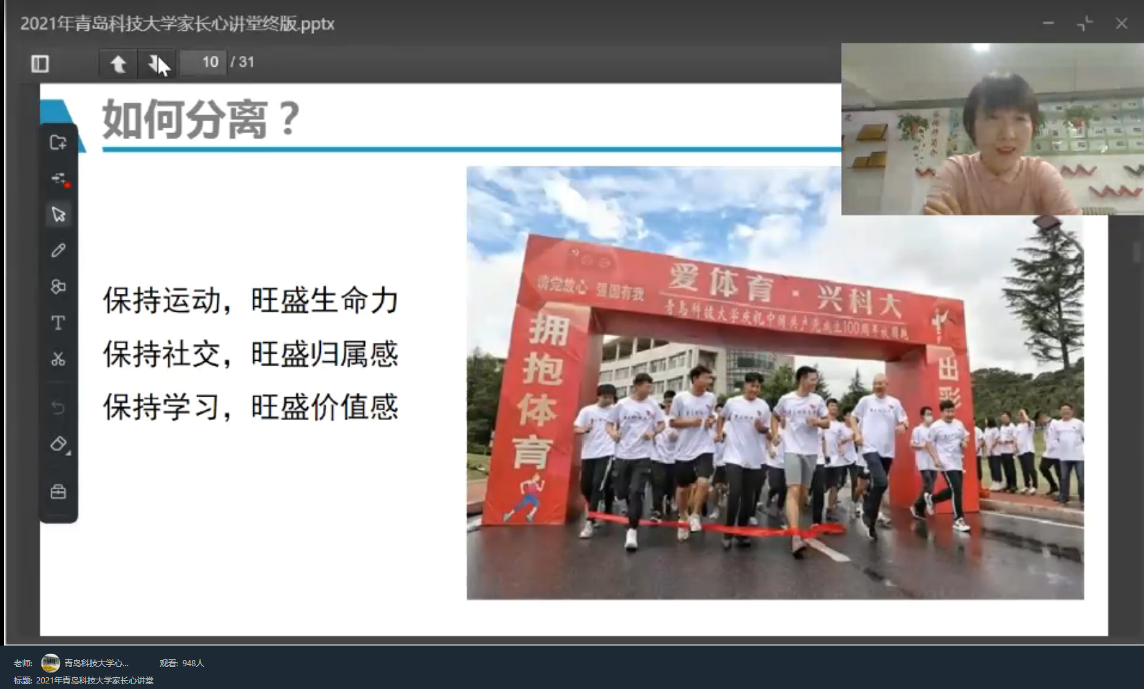 2021级新生入学之际,天游ty8检测中心开展了一场别开生面的“家长心讲堂——如何陪伴新生适应”,大学生心理健康教育与咨询中心老师主讲,内容涵盖“正确看待亲子分离”“大学生的心理发展任务”“如何助力学生心理发展”等方面,两千余名新生家长线上参与,并积极互动。