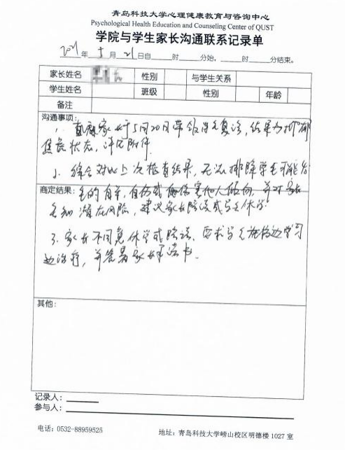 二、用好家校协同育人路径,促使家庭成为学生心理健康的“参与人”。学校建立常规反馈与重要节点反馈相结合的家校沟通反馈机制,辅导员不定期向家长反馈学生的学业、情绪、人际支持等情况,互通有无,确保信息对称。在开学季、考试季、毕业季等特殊节点,辅导员建立“家长工作录”,第一时间反馈危机学生情况,双方协同确定诊疗方案,使得家庭可以从意识和行为层面参与到学生的成长发展中。
