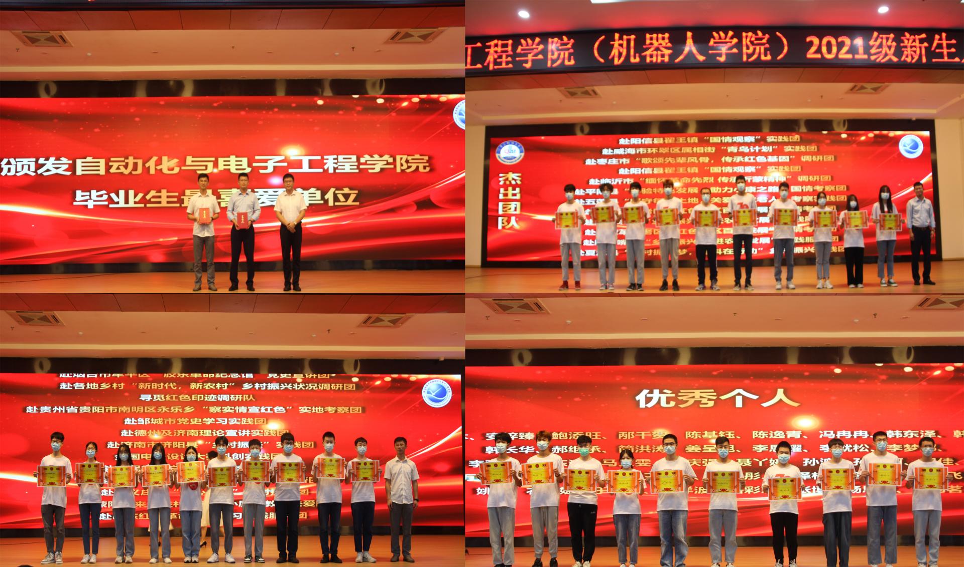 为促进学生德智体美劳全面发展,增强学生实干能力,学院始终高度重视为学生搭建与社会沟通交流的平台,从就业和社会实践入手,开展院企合作,践行实践育人。会上,马寒代表学院向青岛展诚科技有限公司和无锡艾克特电气股份有限公司颁发“毕业生最喜爱单位”证书。与会嘉宾为学院2021年暑期社会实践先进集体和个人颁发奖状。
