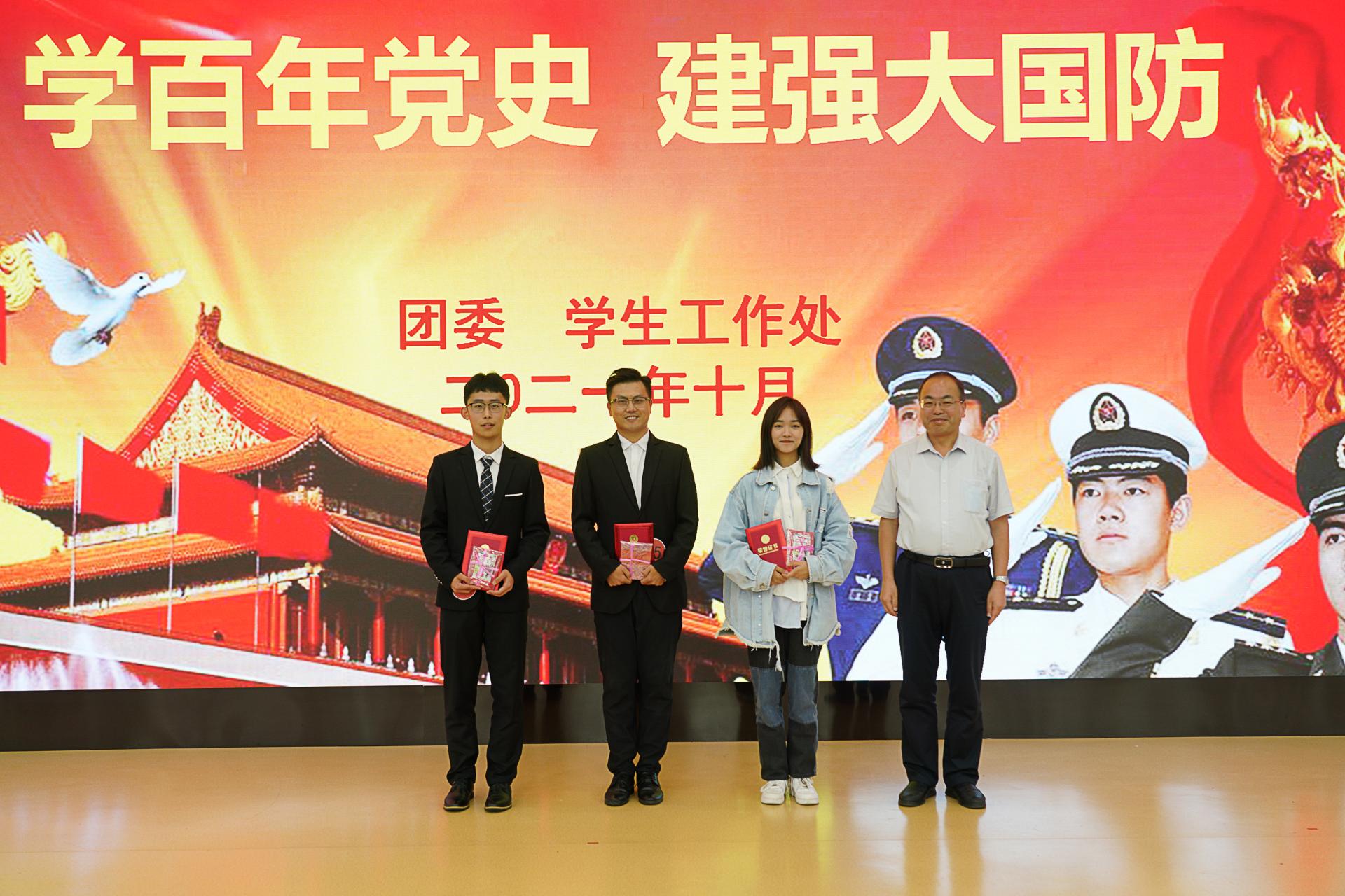 经大赛评委现场评选,高分子学院杨松的《长征我们一直在路上》、海洋学院刘欣怡《中国在这国防在心》、自动化学院阚新磊《国防重任,在于你我》获一等奖;法学院李凯玥《百年接力,强国有我》、潘昱洁《与党同行,与英雄同行》、经管学院刘传敏《爱我中华,情系国防》、鲁亦璨《学百年党史,建强大国防》、环境学院提雪艺《学党史,跟党走,强国防》获二等奖;化学院李若琳、高分子学院朱万超、艺术学院郭思伊、法学院吴佳鑫、环境学院杜晓君、侯丽华、信息学院孟雨霏同学获三等奖。现场为获奖选手颁发了荣誉证书和纪念品。