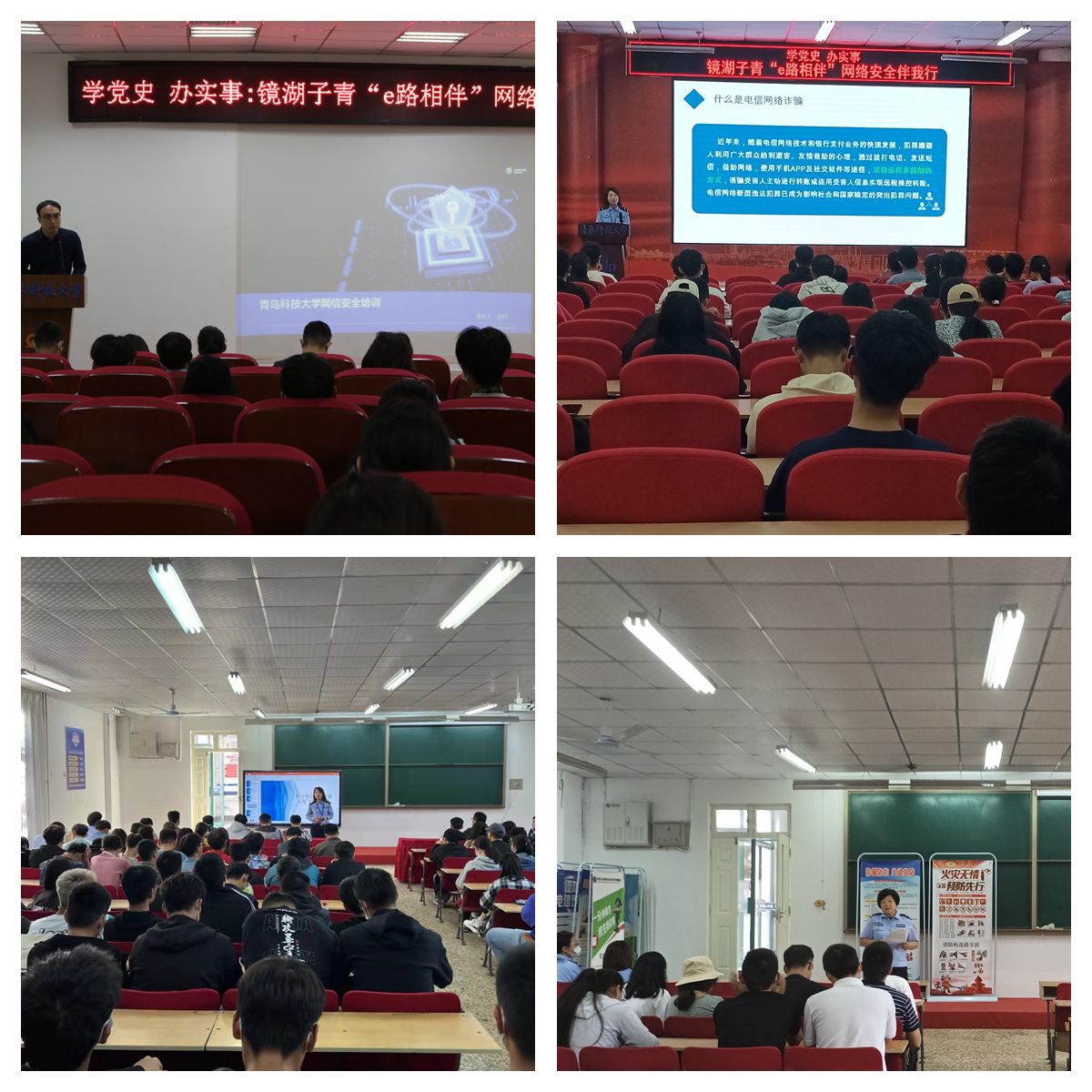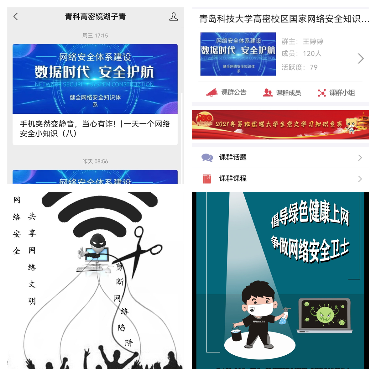 通过在高密校区镜湖子青“e路相伴”网络思政平台上开辟“数据时代、安全护航”专栏,依托校园广播、LED屏幕、宿舍屏幕等平台播放相关视频、文字、图片,举办“网络安全海报设计大赛”等方式普及基本的网络知识。邀请深信服科技股份有限公司讲师为校区安全员队伍开展“网络安全进班级”专题讲座。邀请高密市南关派出所民警分别在通德会堂和青科师生平安港为校区师生开展“别让电信网络诈骗折断飞翔的翅膀”主题讲座、“国家反诈中心”APP及“金钟罩”小程序推广普及以及网络安全防范技能培训。通过易班平台开展为期一周的国家网络安全知识竞赛。各位团总支结合安全教育普遍开展网络安全主题班会,以实例讲授+教育总结的方式,不断增强防骗的力度。