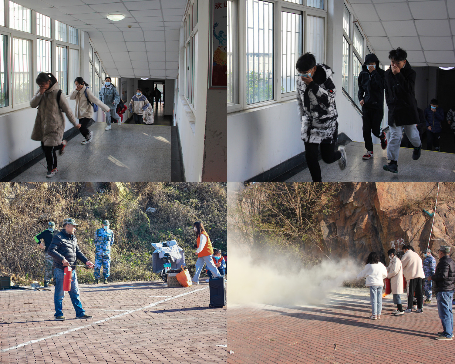 随着警报响起,烟雾弹施放,消防演练正式开始。同学们按照紧急疏散路线,迅速有序地向北苑餐厅平台疏散,在短时间内完成全员安全逃生。