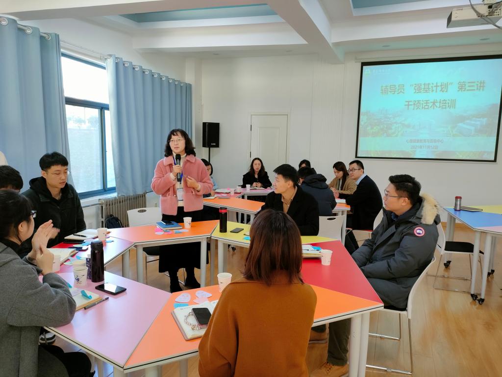 为进一步贯彻落实《高等学校学生心理健康教育指导纲要》文件精神,提高辅导员心理危机干预水平,11月13日上午,学校在崂山校区心理中心团辅室开展辅导员“强基计划”第三讲——危机干预话术培训。党委学生工作部副部长王丽出席,心理中心主任李海玲主讲,37位专职辅导员参加本次培训。