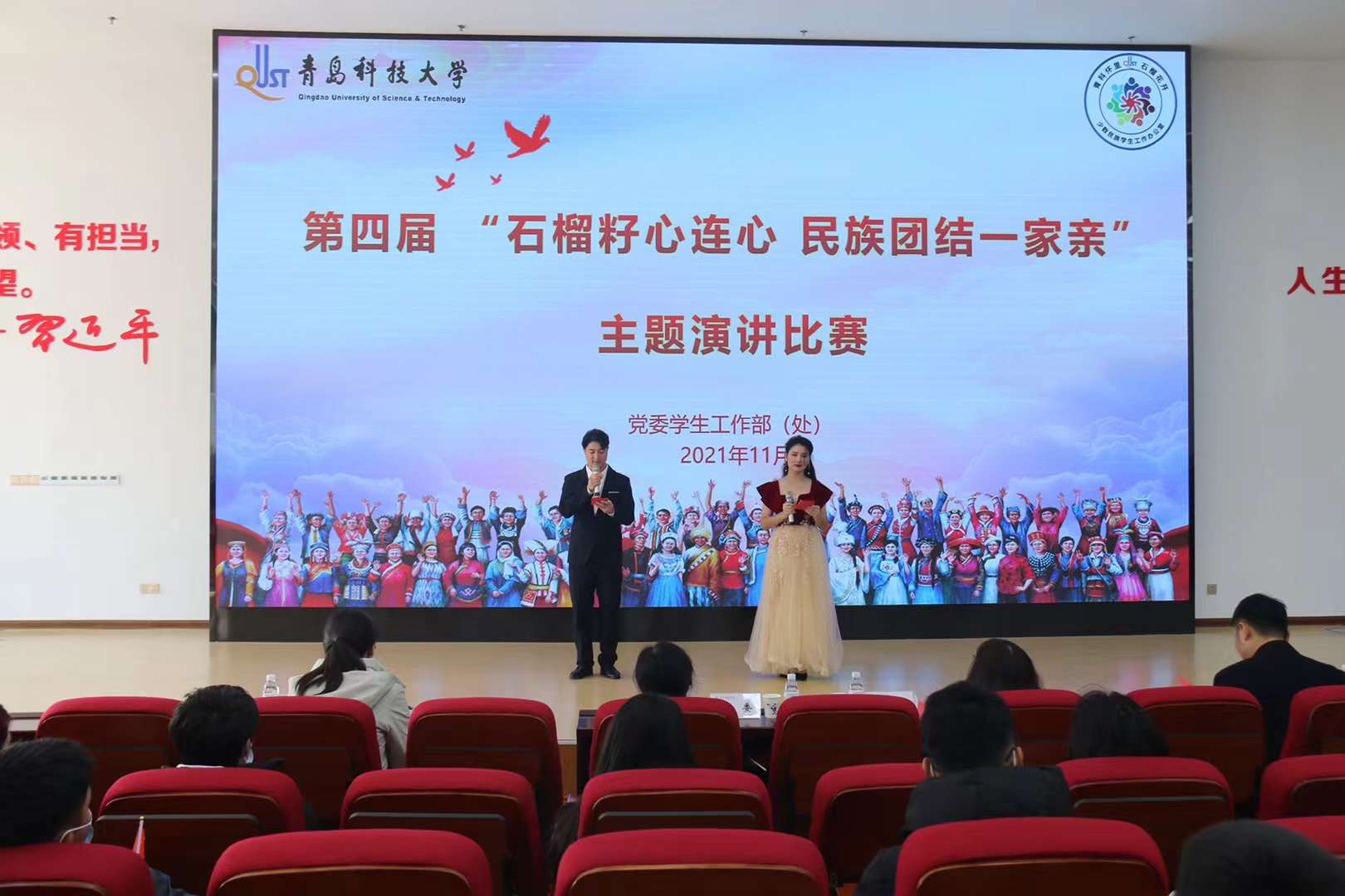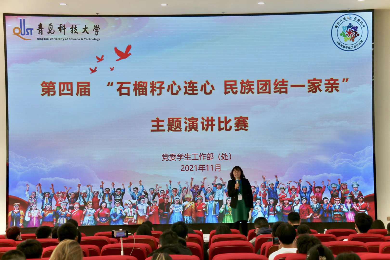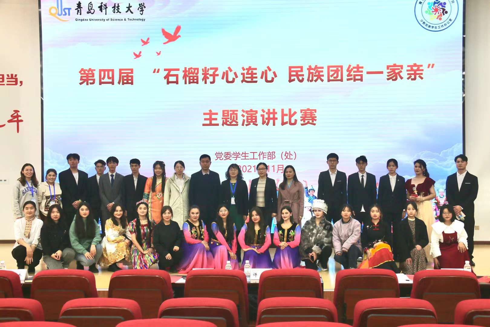 为教育引导广大学生铸牢中华民族共同体意识,促进各民族学生交往交流交融,11月30日下午,学校“青科怀里 石榴花开”之第四届少数民族学生“石榴籽心连心 民族团结一家亲”主题演讲比赛在崂山校区团学报告厅举行。校党委宣传部、统战部、学生工作部、校团委、保卫处等部门负责人出席活动并担任评委。