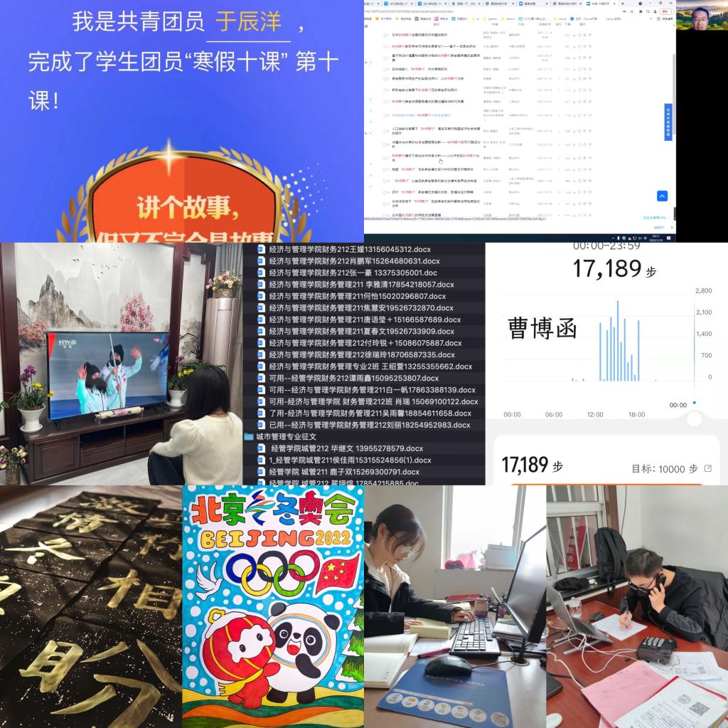经管学院持续构建“五育并举”协同育人模式,助力学生实现黄金期“弯道超车”,强化德育提升素养,组织全体学生参与“传承红色基因、争做时代新人”红色征文活动并积极投稿学校;开展“我的读书日记”读书活动,并分阶段引导学生做好读书笔记、撰写读书报告;组织学生积极开展“寒假十课”学习并跟踪进度,以主题团课的形式组织全体学生学习共青团十八届六中全会精神,组织全体学生观看冬奥会开幕式,并积极参与“迎冬奥,我来赛”网络知识竞赛,激发冬奥会等时政热点的思想政治教育功能。强化智育巩固学业,引导全体学生聚焦自身主责主业,成立专业内部学习互助组开展课程补习,利用假期时间及时查漏补缺;围绕科创竞赛全面铺开,组织全体学生积极参与科创赛事,并就学生组队、选题、指导、ppt制作、参赛经验分享及心理辅导等开展“一条龙”服务,助力学生培育科创思维。强化体育夯基固本,组织学子积极响应学校“科大与你一起ying冬奥·年”活动,利用微信运动、运动器械等开展体育运动,确保每日步数 6000 步以上、运动里程 2Km 以上、运动时长超过 40 分钟,以实际行动积极响应学校“爱体育·兴科大”号召。强化美育涵养情感,充分利用春节、冬奥会契机,组织学生积极参与“天游ty8检测中心首届“我和我的家乡”短视频/摄影大赛”“一起ying冬奥·年”活动,鼓励学子将情感付诸笔端与镜头,用书法、绘画、vlog视频作品等表达对春节及北京冬奥会的祝福。强化劳育淬炼意志,组织全体学生积极参与寒假社会实践,积极发挥各年级学生干部、党员骨干的先锋模范和桥梁纽带作用,围绕“青鸟计划”、“一起云支教 共同迎冬奥”专项活动等实践开展全程指导,引导学子在实践锻炼中磨练意志、增长才干。