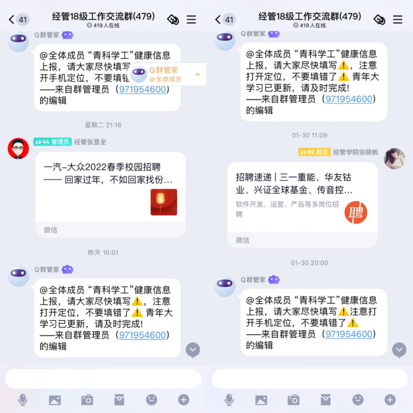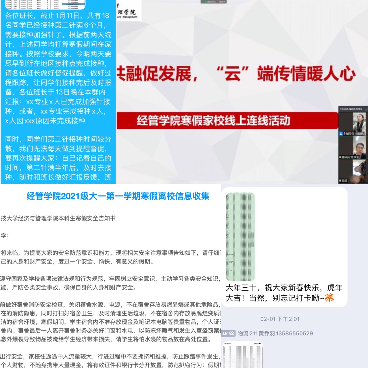 关注学生行为动态,严格落实学校疫情防控要求,及时更新并掌握所有学生的假期动态去向和出行轨迹,建立一人一台账,全面摸底家庭所在地为疫情中高风险地区的学生,做好居家疫情防控,严格执行学校、学院各项管理规定,织牢织密“网格化”疫情防控网。做好假期健康防护,敦促全体学生进行“青科学工”健康日报,提高学生疫情防控常态化思想认识,引导学生遵守疫情防控行为规范。强化疫苗接种工作,细致建立疫苗接种台账,定期更新学生疫苗接种情况,引导学生“应接尽接”,自愿在家乡就近接种。加强家校育人合力,各年级根据学校及学院寒假走访规定开展“云端”走访工作,并与学生、家长就学校政策、学生在校情况等开展良性互动,培育家校共育良好氛围。关注心理健康动态,依托“校-院-班-舍”四级联动平台,利用“三微一端”及时转发心理健康知识,适时做好家庭困难、心理困难、学习困难、疫情中高风险地区等学生的“点对点”沟通纾解,助力学生度过平安充实的假期。