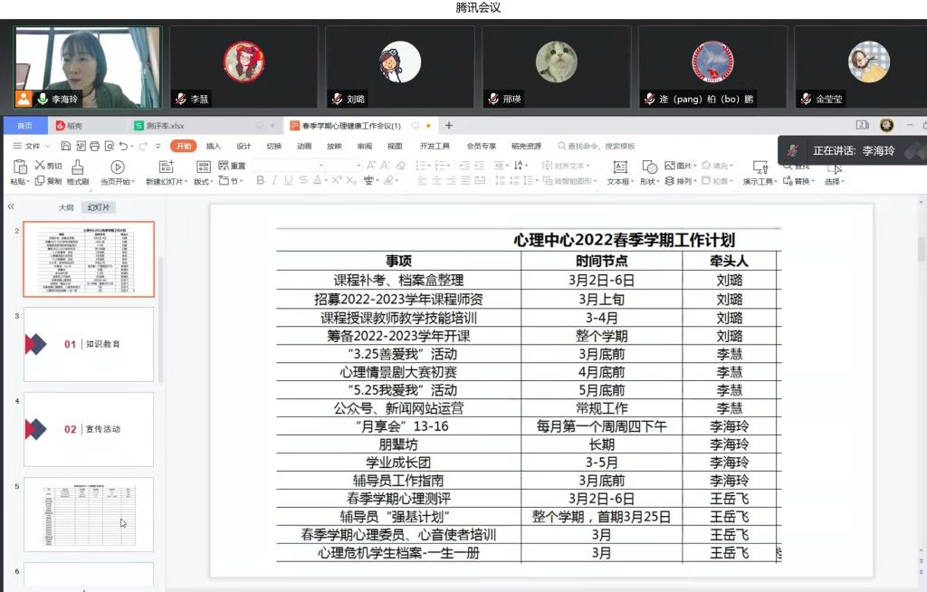 王岳飞就春季学期心理素质测评情况向各位站长进行反馈,并对后期危机排查工作要点进行了详细说明。此外,李慧立足“以爱之名”心理健康教育连续曲主题解读了本学期宣传活动的安排与计划。