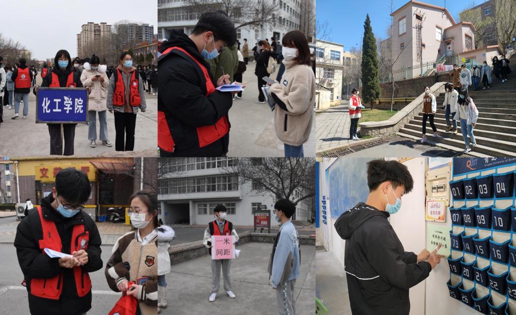 勇挑重任,在疫情防控上诠释担当。准确掌握在校生学生、校外学生和暂缓返校学生情况。常态化做好2545名在校学生全员核酸检测和20%抽检工作,以年级为小组、班级为单位划定核酸检测签到区、排队区、等候区,全体专兼职辅导员全程陪伴、守护、监督,确保检测快速、高效、有序。按时完成发热等症状异常情况和因病缺勤学生备案,每天100%完成健康日报打卡,落实学生晚点名制度。应急处理学生紧急情况3例,其中21级河南籍学生母亲病危,学院第一时间联系山东、河南两地疫情防控指挥部,了解防控政策,畅通返乡渠道,让学生见到母亲最后一面。学院尽心竭力、全情投入,让疫情防控有情、有度、有心、有爱。