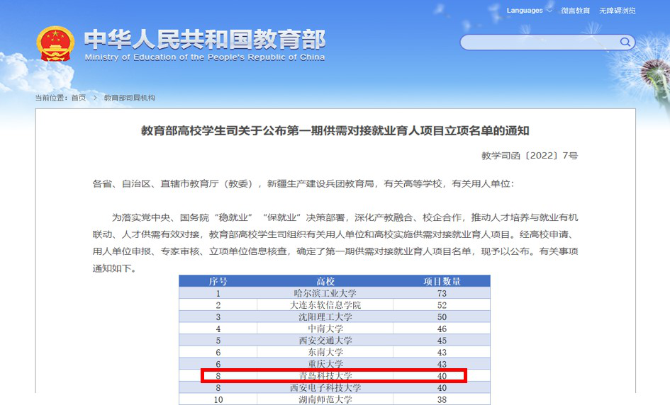 近日,教育部发布了《关于公布第一期供需对接就业育人项目立项名单的通知》(教学司函〔2022〕7号),天游官网就业育人项目立项40个,立项总数在全国立项成功的1268所高校中排名第8位,在山东省内所有高校中排名第1位。