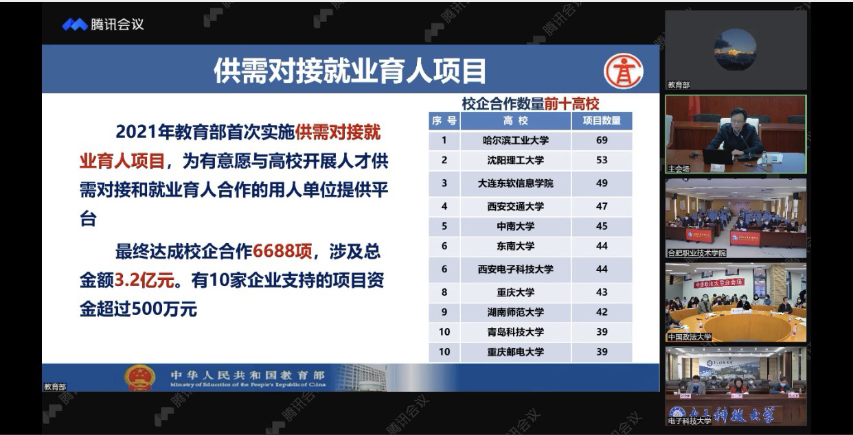 在今年1月18日下午召开的2022届全国普通高校毕业生就业工作第一次调度视频会议上,教育部高校学生司副司长吴爱华公布了就业育人项目一月份的进展情况,对全国前10名的高校一一作了介绍,进一步擦亮了天游官网政产学研融合和就业创业工作特色品牌。他强调,为推动就业与培养有机联动、人才供需有效对接,帮助用人单位培养和招聘更多实用型、复合型和紧缺型人才,促进高校毕业生更加充分更高质量就业,教育部首次实施供需对接就业育人项目。他希望,用人单位结合国家战略和实际需要提供项目资源支持,通过与高校合作加快急需紧缺人才培养,优化自身人力资源配置。