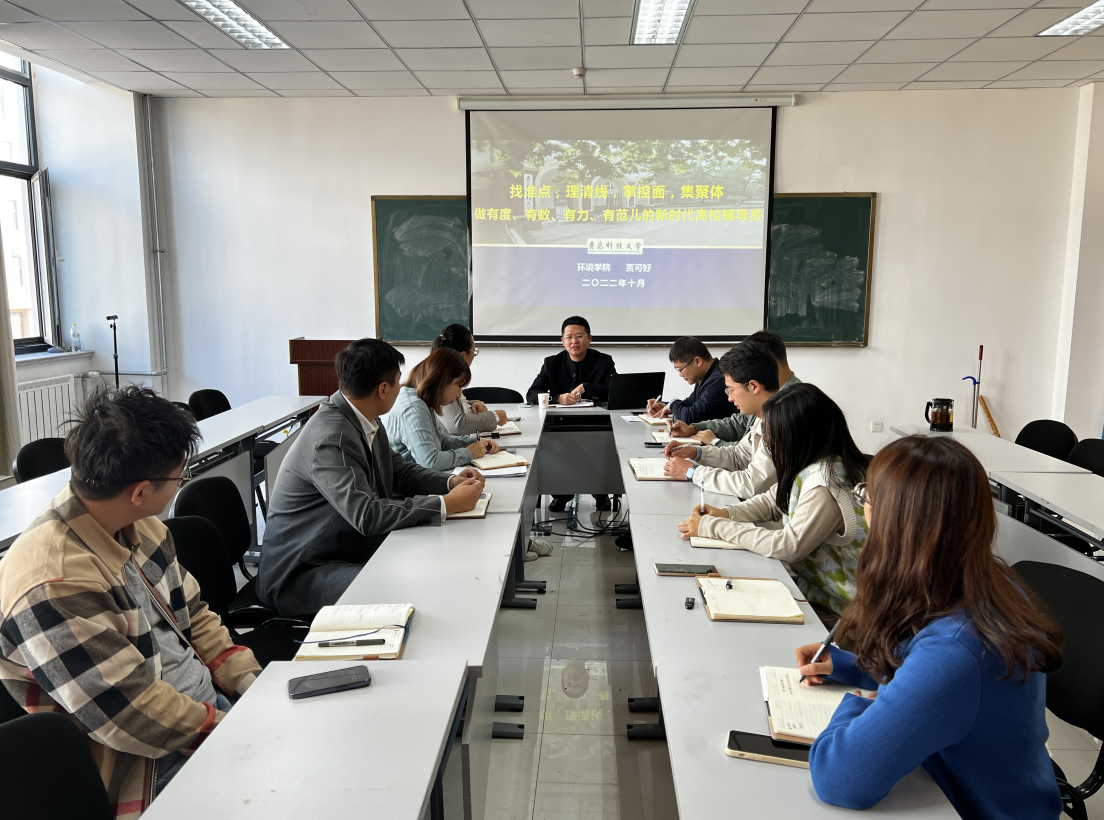 为深入贯彻落实习近平总书记全国高校思政工作会议的重要讲话精神,切实提升辅导员素质能力,推动学院辅导员队伍建设朝着职业化、专业化发展,10月27日上午,自动化学院在学院406会议室开展辅导员自主培训第三讲,环境学院党总支副书记兼副院长贾可好副教授做“找准点,理清线,掌控面,集聚体,做有度、有数、有力、有范儿的新时代高校辅导员”主题分享,学院党委副书记兼副院长马寒、全体专职辅导员参加本次培训。