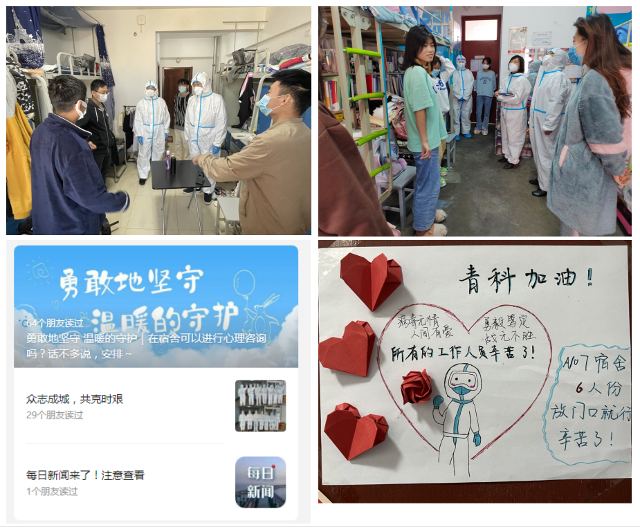 关心关怀,坚定战“疫”信心。宿舍静默管理期间,各学院领导班子成员、辅导员等管理干部坚持以学生为中心,深入学生宿舍,开展走访慰问、谈心谈话活动,坚定学生战“疫”信心,了解学生学习生活情况及存在的困难与诉求,全力保障学生的学习和生活,切实完善全员全过程全方位育人机制,做到解决学生实际问题与思想问题相统一。学校心理健康教育与咨询中心把“战场”从办公室转移到学生宿舍,迅速组建专兼职咨询师和朋辈咨询师9人坚守岗位,确保咨询服务“5+2”“白+黑”不断线。疫情发生后,发布睡眠调适、心理援助渠道、宿舍团辅推文3篇,收到学生来信6封,妥善处理特情5起,持续关注校外隔离10名危机学生,保证特殊时期学生心理健康。