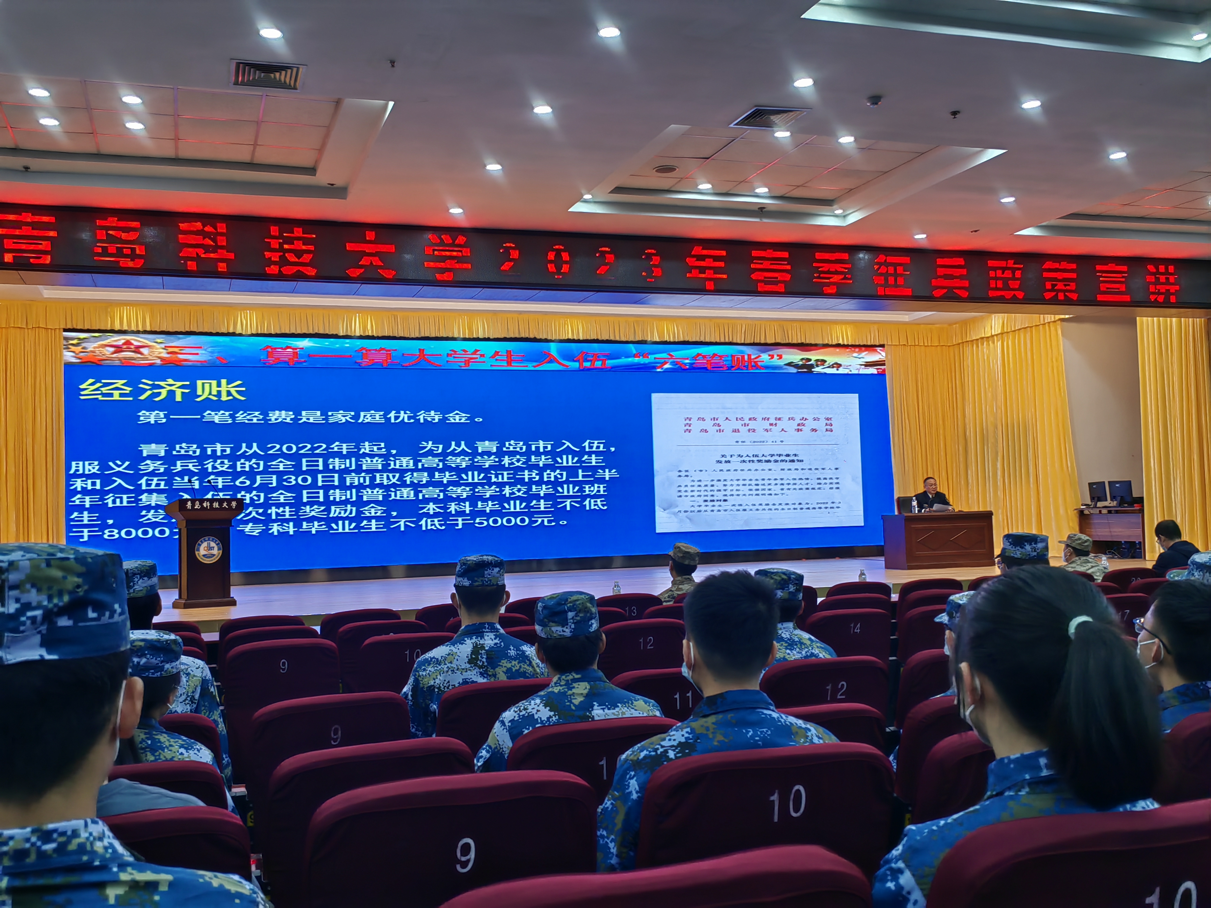 11月29日下午,天游官网2023年春季征兵政策宣讲会在崂山校区第二报告厅举行。市北区党委常委、武装部部长张庆龙、副部长刘伟杰、军事科长赵云飞入校开展征兵宣讲,学校武装部全体参加。宣讲采取线上线下相结合的形式进行,崂山校区有入伍意愿部分学生代表到现场观看宣讲,学校共有1706名入伍意愿的学生在线上收看了宣讲,宣讲会由武装部副部长曹永俊主持。