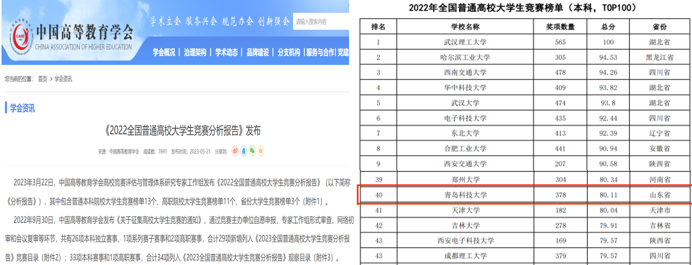 日前,中国高等教育学会发布了《2022全国普通高校大学生竞赛榜单》,学校在2022年排行榜中位列全国第40位,位列山东高校第4位,再创新高。根据榜单显示,近5年,学校学科竞赛排行分别为:101位、99位、75位、45位、40位,全国排名逐年攀升。