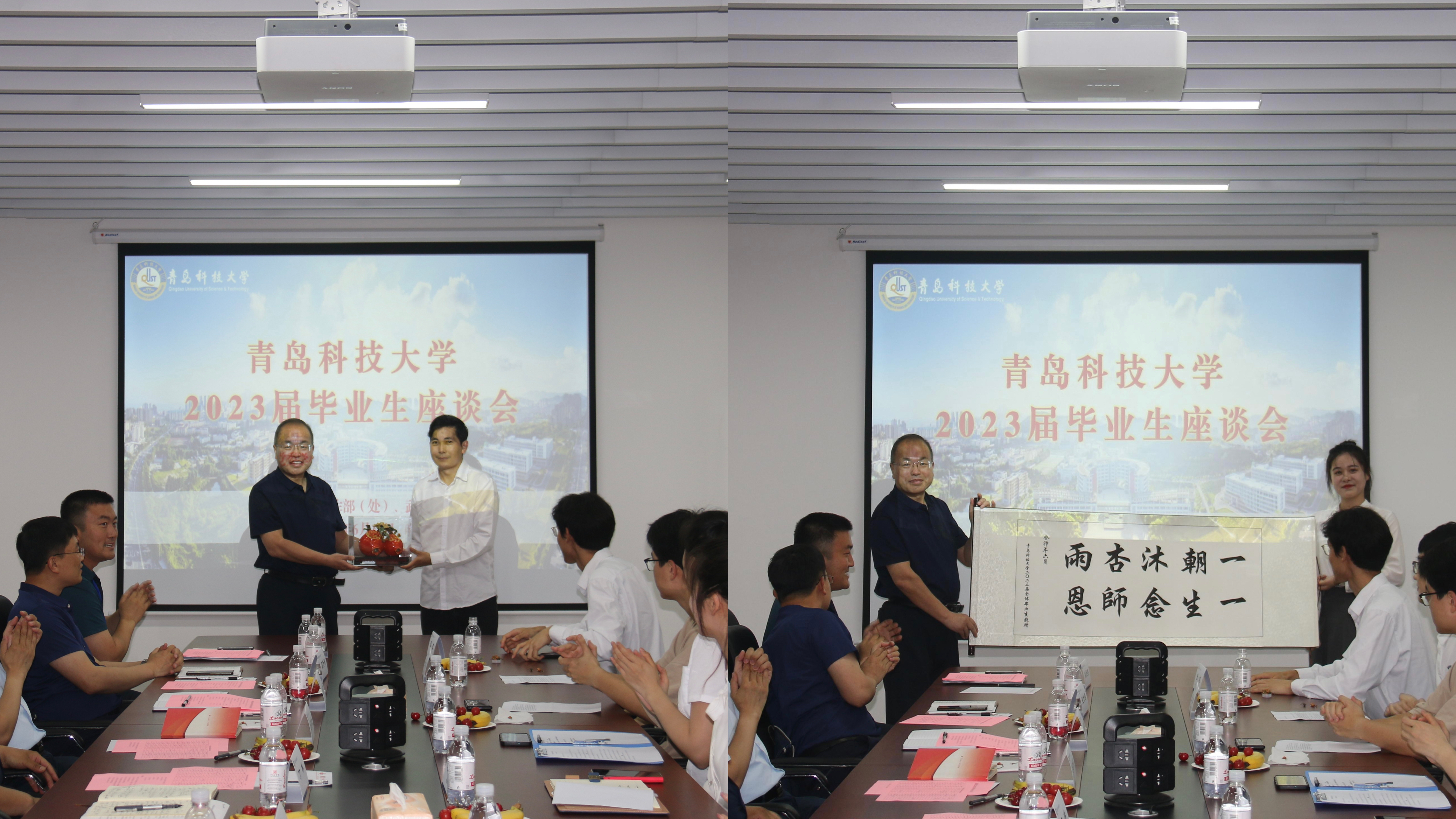 与会24位毕业生代表结合自身经历,回顾了丰富多彩的大学生活,表达了对母校的感恩眷恋之情,展望了即将启程的未来之路,同时还就学校发展、教学科研、就业创业、校园文化和后勤保障等积极建言献策。丁林代表学校向毕业生代表赠送青科文创纪念品,2023届毕业生代表向学校赠送《一朝沐杏雨,一生念师恩》书法作品,少数民族毕业生代表向学校赠送《青科石榴籽》艺术作品。