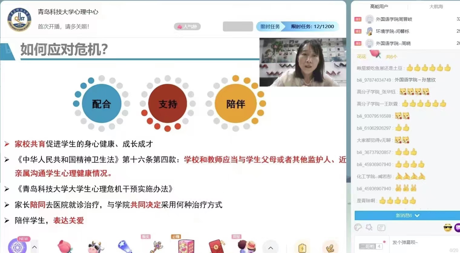 孩子们进入大学对父母而言也是一个新的开始,这期间父母和孩子都将出现一些新的情感体验和感受,面对一些新的挑战。李海玲以校园中的真实案例为切入点,围绕“恰当应对亲子分离”“大学生心理发展危机”“如何助力学生心理成长”三个方面作了详细阐述,她结合自己丰富的咨询经验,以案例的形式生动形象的向家长展示了如何对孩子表达共情、如何进行一致性沟通,如何处理心理危机。直播过程中弹幕不断,家长纷纷表示收获颇丰,澄清了过去的教育误区。最后,为帮助家长进一步了解心理工作,李海玲从教育教学、咨询服务、预防干预、宣传活动四个方面介绍了学校心理健康教育工作的主要内容。
