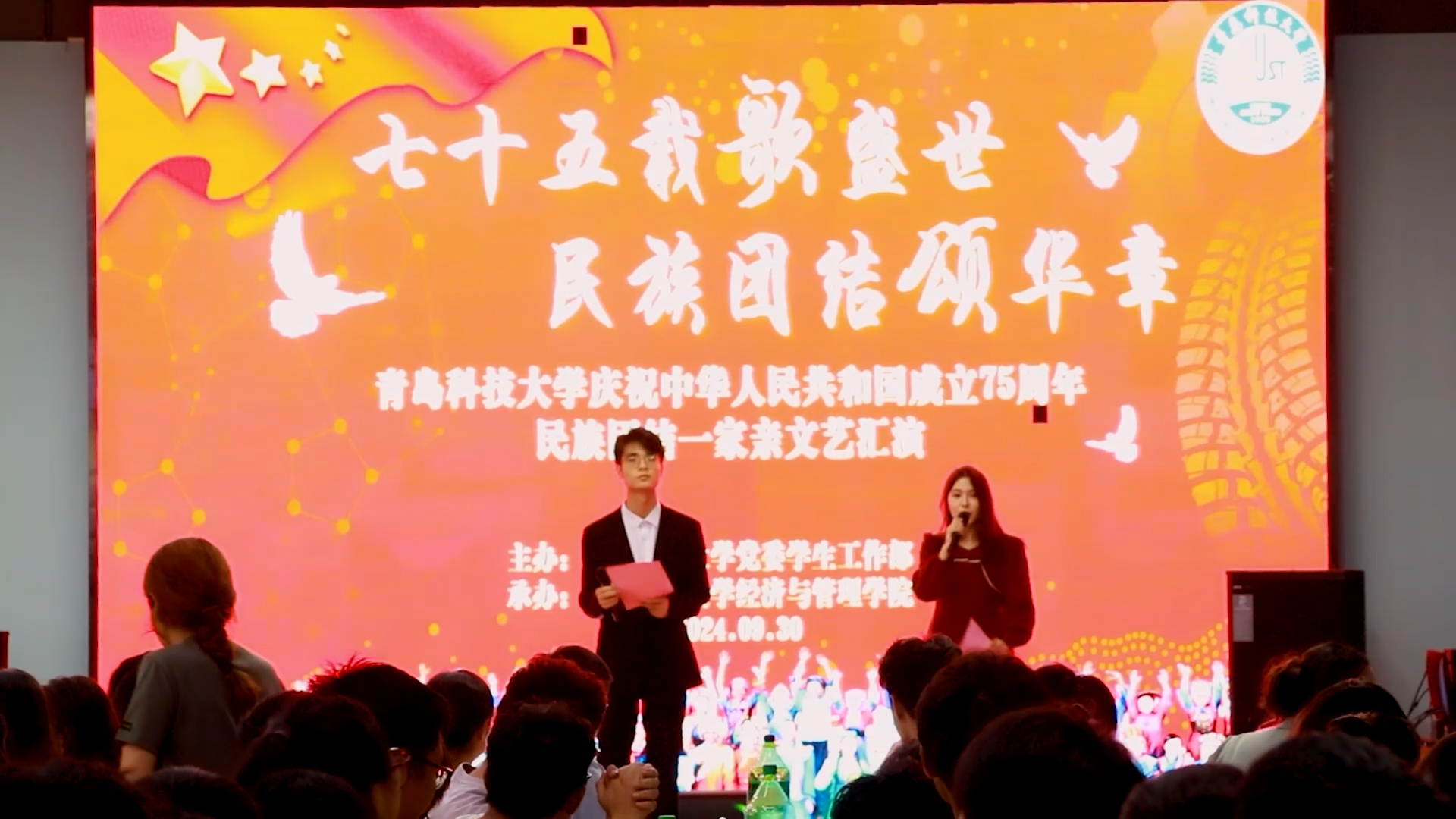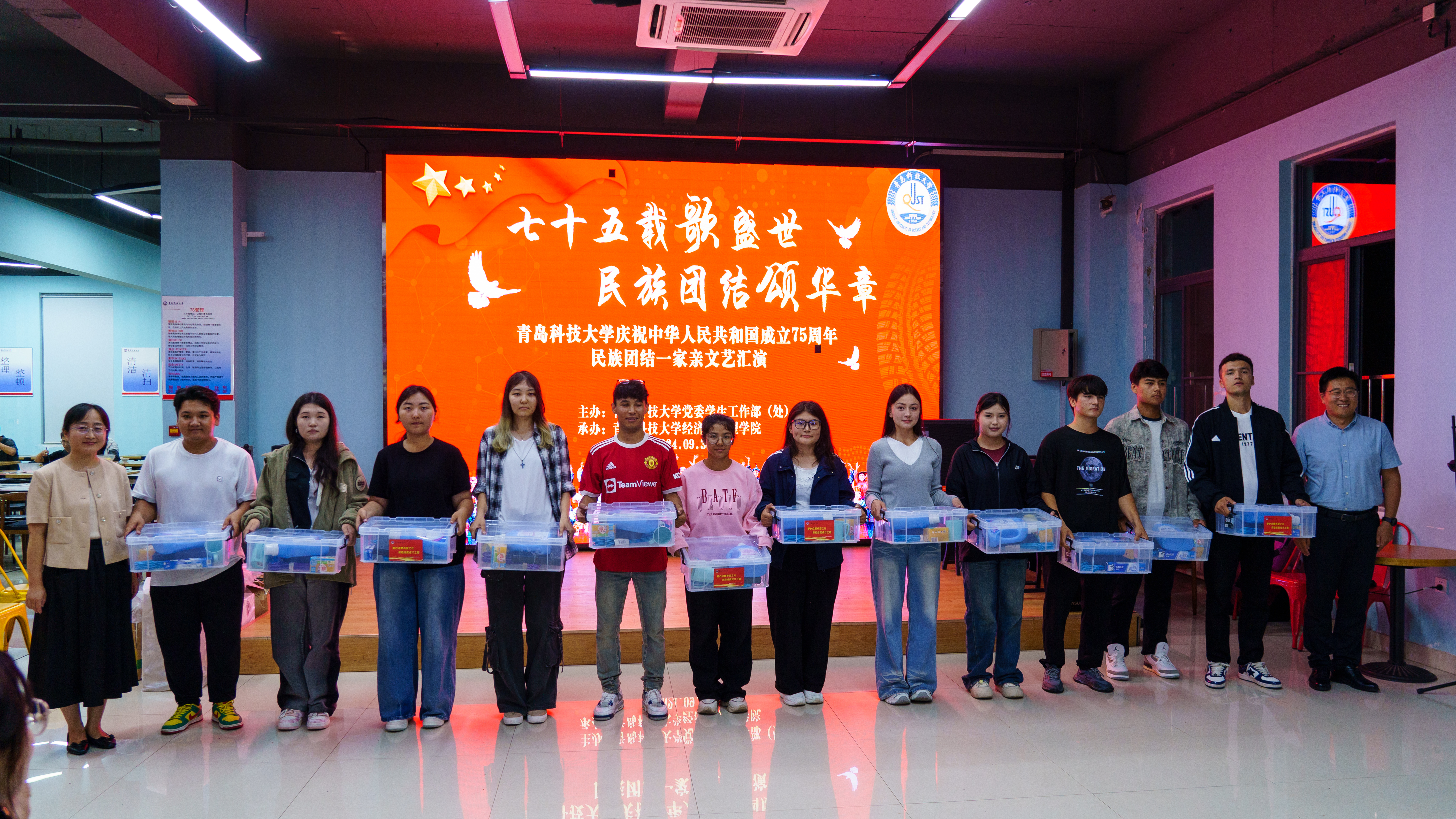 为热烈庆祝中华人民共和国成立75周年,促进学校各民族师生的广泛交往交流交融,9月30日晚,在崂山校区北苑餐厅组织开展了“七十五载歌盛世 民族团结颂华章”天游ty8检测中心庆祝中华人民共和国成立75周年民族团结一家亲文艺汇演。党委统战部副部长魏琳、学生工作处副处长尤亭亭、校团委副书记李浩、学校相关部门老师、学校少数民族办公室、部分学院辅导员老师及200余名各民族学生参加了此次活动。