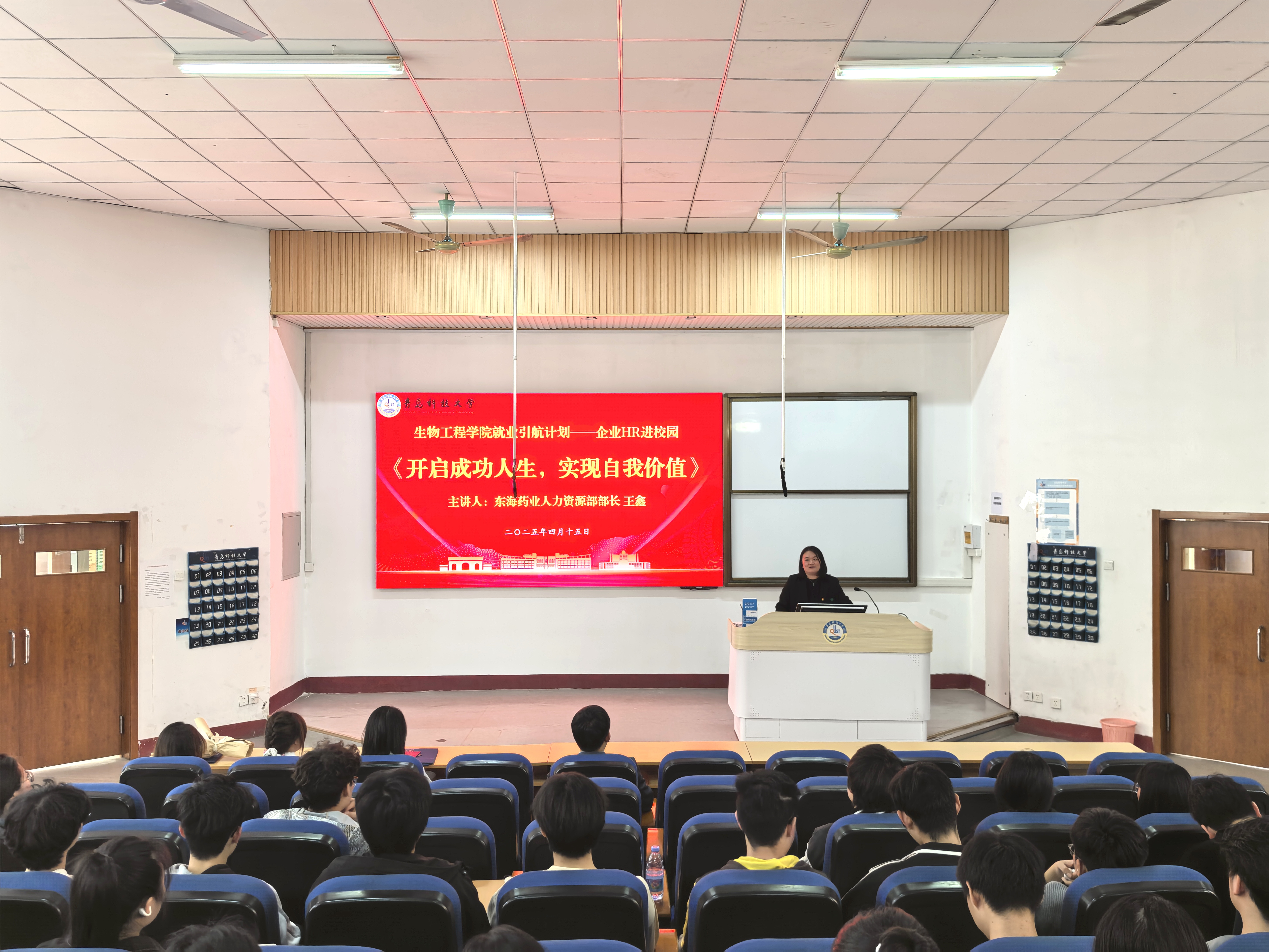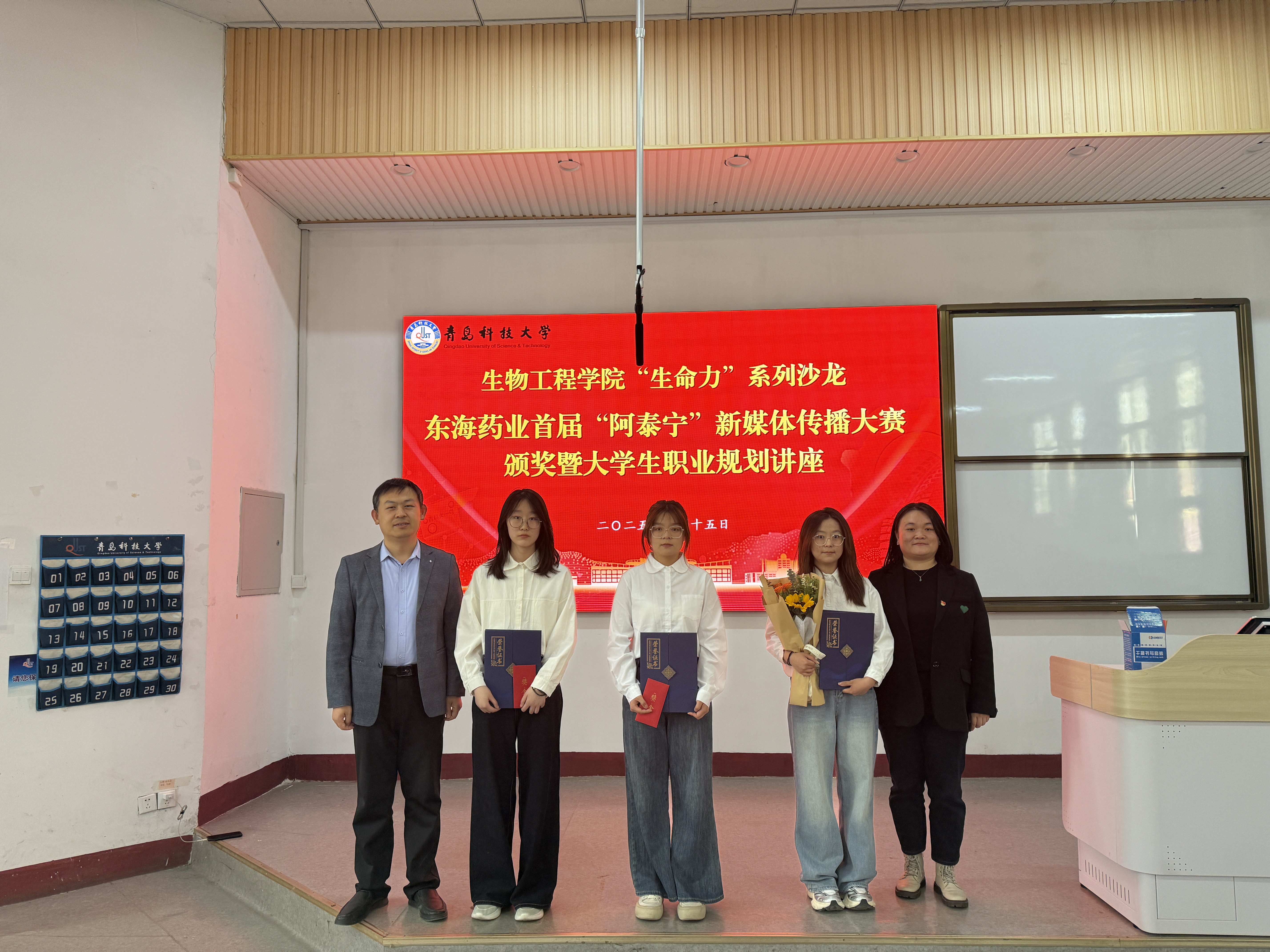 近日,生物工程学院在第二教学楼101教室举行“生命力”系列沙龙——东海药业首届“阿泰宁”新媒体传播大赛颁奖暨大学生职业规划讲座,东海药业人力资源部部长王鑫、招聘经理张海霞,生物工程学院学工办主任秦洪庆、副主任刘金岭以及学生代表参加本次活动。
