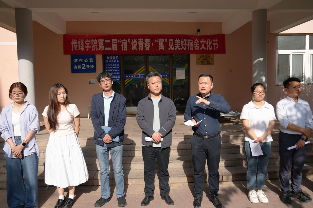 为进一步加强宿舍建设,营造健康文明、积极向上的宿舍文化氛围,提高传媒学子文明素养,5月20日下午,传媒学院在崂山校区南苑2号宿舍楼前开展第二届“宿”说青春·“寓”见美好宿舍文化节系列活动。学校公寓服务中心主任林勇,学院党委副书记兼副院长刘海波、辅导员赵岩、刘福民,以及各年级班委、舍长代表等参加活动。活动由学院团委副书记兼学工办副主任金莹莹主持。
