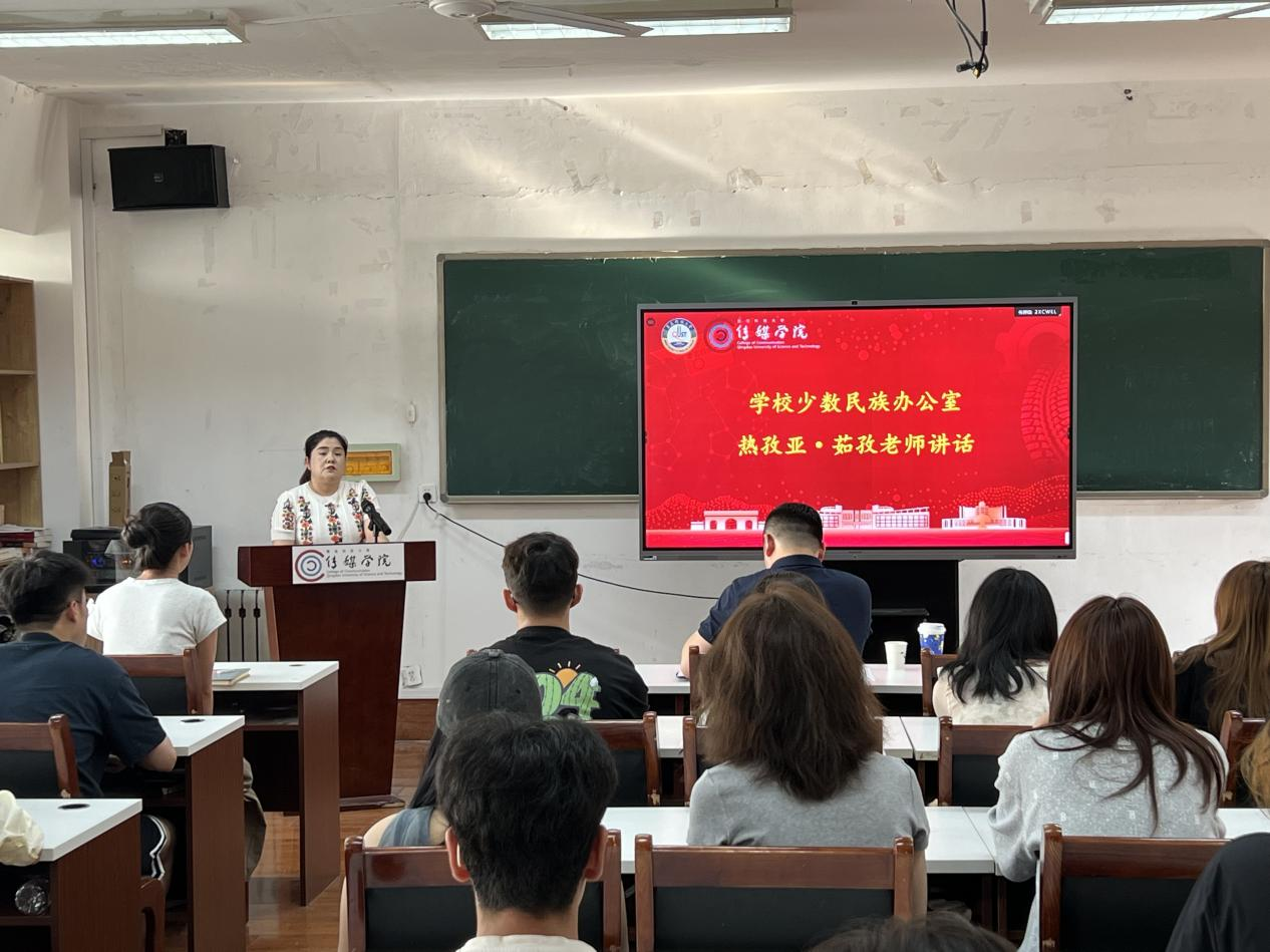 热孜亚·茹孜介绍了学校少数民族学生工作办公室的有关工作,肯定了传媒学院在少数民族工作方面的努力,并结合个人学习、生活和工作经历,鼓励同学们要认真学习,遵规守纪,感恩学校各类奖助政策,充分利用好学校、学院搭建的平台提升专业知识和技能,积极参加学科竞赛和社会实践,坚定信心、珍惜当下,守正创新、勇毅前行,为将来发展打下坚实的基础,为服务学校和经济社会发展贡献智慧和力量。