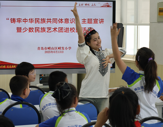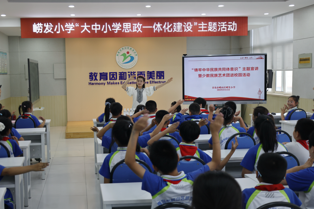 活动当天,学院少数民族艺术团学生代表米娜瓦尔・艾依热提和依克山・阿布拉提江走进崂发小学课堂,为小学生们带来了一场别开生面的铸牢中华民族共同体意识主题教育宣讲。他们用生动活泼的语言,讲述了一个个关于民族团结的感人故事:从古代各民族之间的友好往来,到现代各民族共同建设祖国的伟大成就,让孩子们深刻感受到中华民族大家庭的温暖和力量。此外,他们还通过舞蹈互动的方式,邀请孩子们亲身体验少数民族舞蹈的魅力,在欢快的节奏中,铸牢中华民族共同体意识如同种子一般,在青少年心中悄然生根发芽。