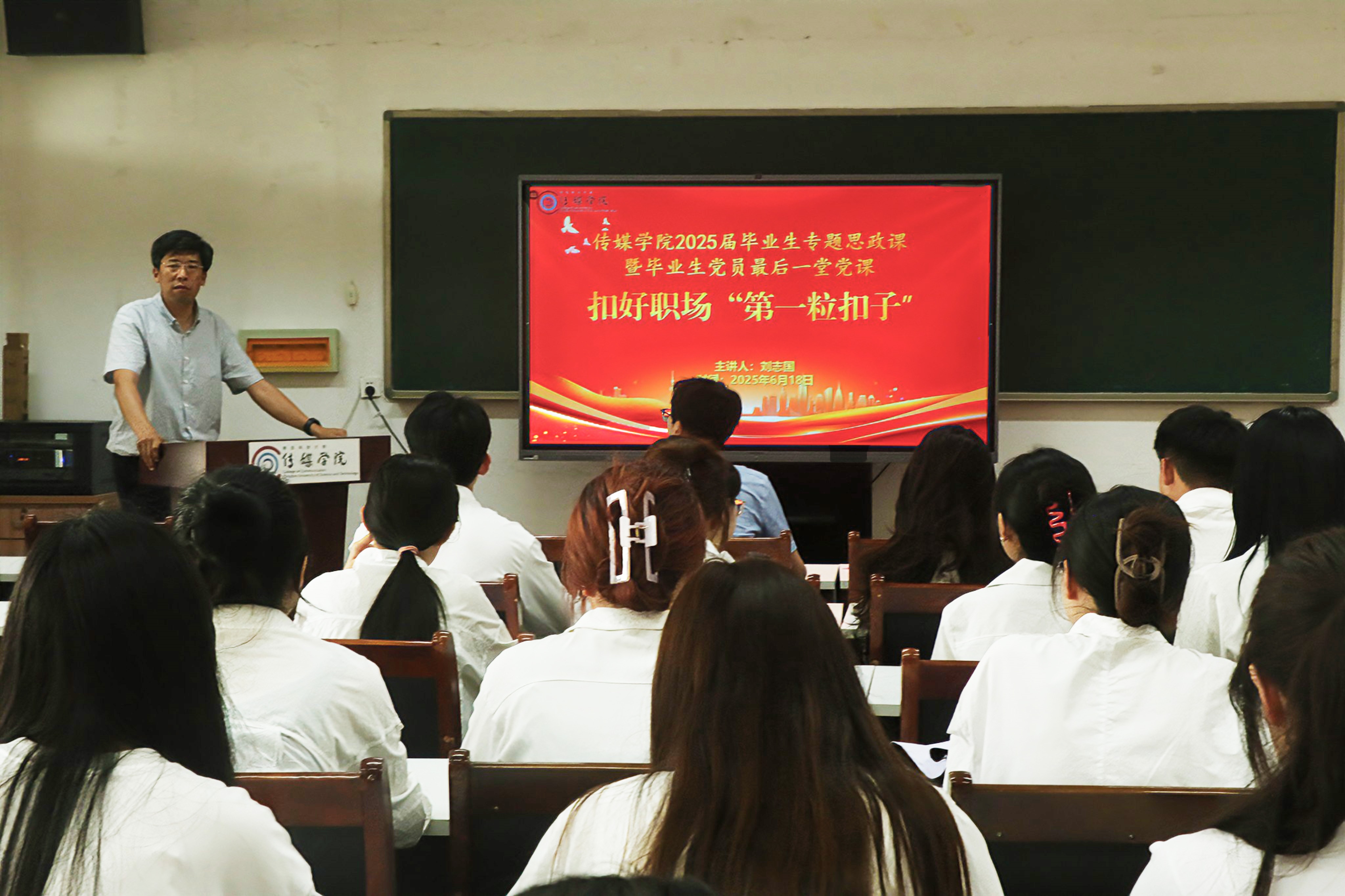 为深化大学生思想政治教育,强化毕业生党员理想信念,6月18日下午,传媒学院学院党委书记刘志国以扣好职场“第一粒扣子”为题,在学院310会议室讲授2025届毕业生专题思政课暨毕业生党员最后一堂党课。课堂由学院辅导员赵岩主持。