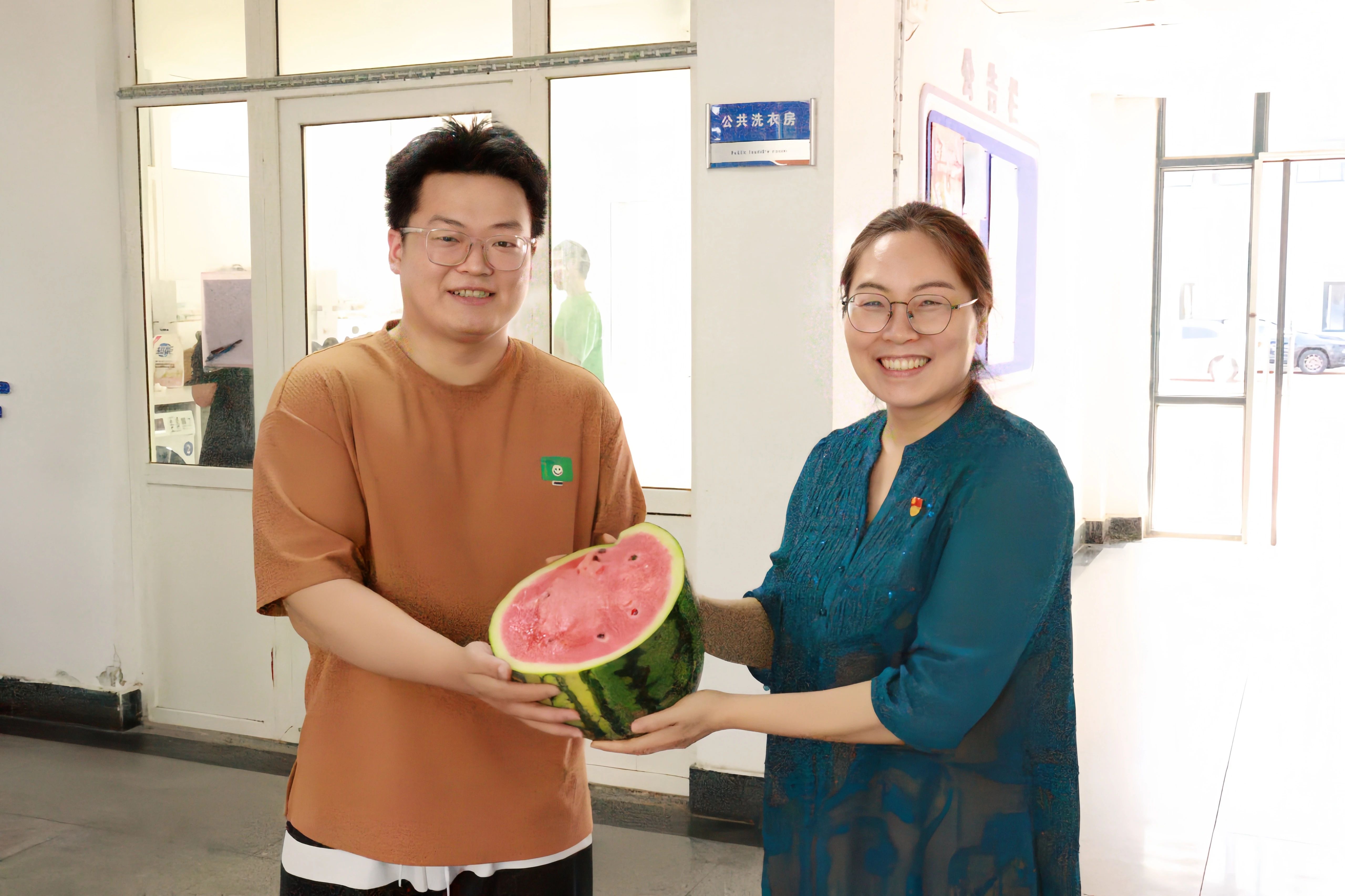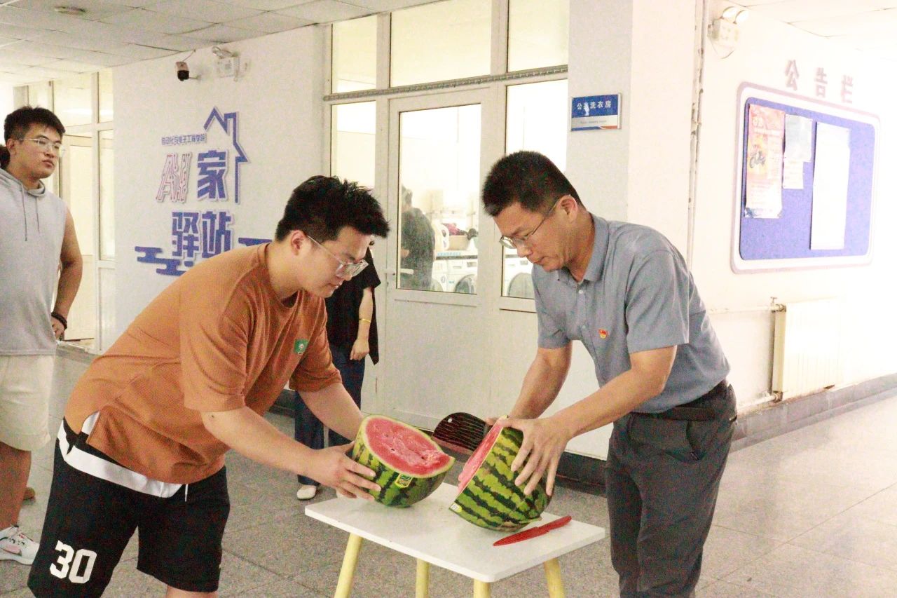 欢送会现场气氛热烈而温馨,学院精心筹备“瓜香送远行”特色环节。李卉、刘名森共同向毕业生代表馈赠解暑西瓜,寓意学子们未来生活“瓜熟蒂落、硕果累累”,事业发展“红红火火、甜美如饴”。现场师生共切“毕业瓜”,在欢声笑语中共话校园往事,畅叙理想抱负,定格珍贵记忆。