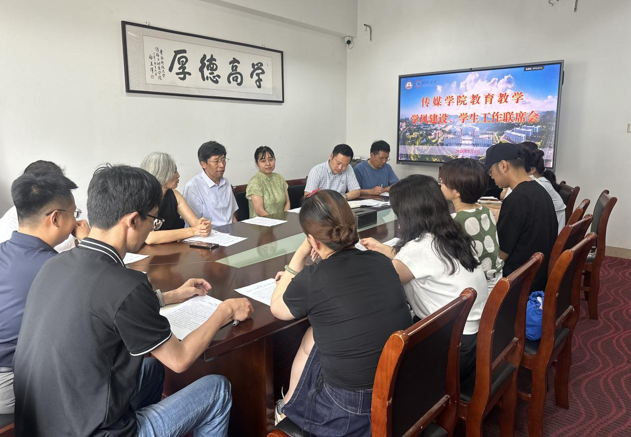 为落实立德树人根本任务,推进教育教学高质量发展,7月1日,传媒学院在315会议室召开教育教学、学风建设、学生工作联席会。学院党委书记刘志国、副院长庄莹,以及各专业相关负责人、教师代表和全体辅导员参加会议。会议由学院党委副书记兼副院长刘海波主持。
