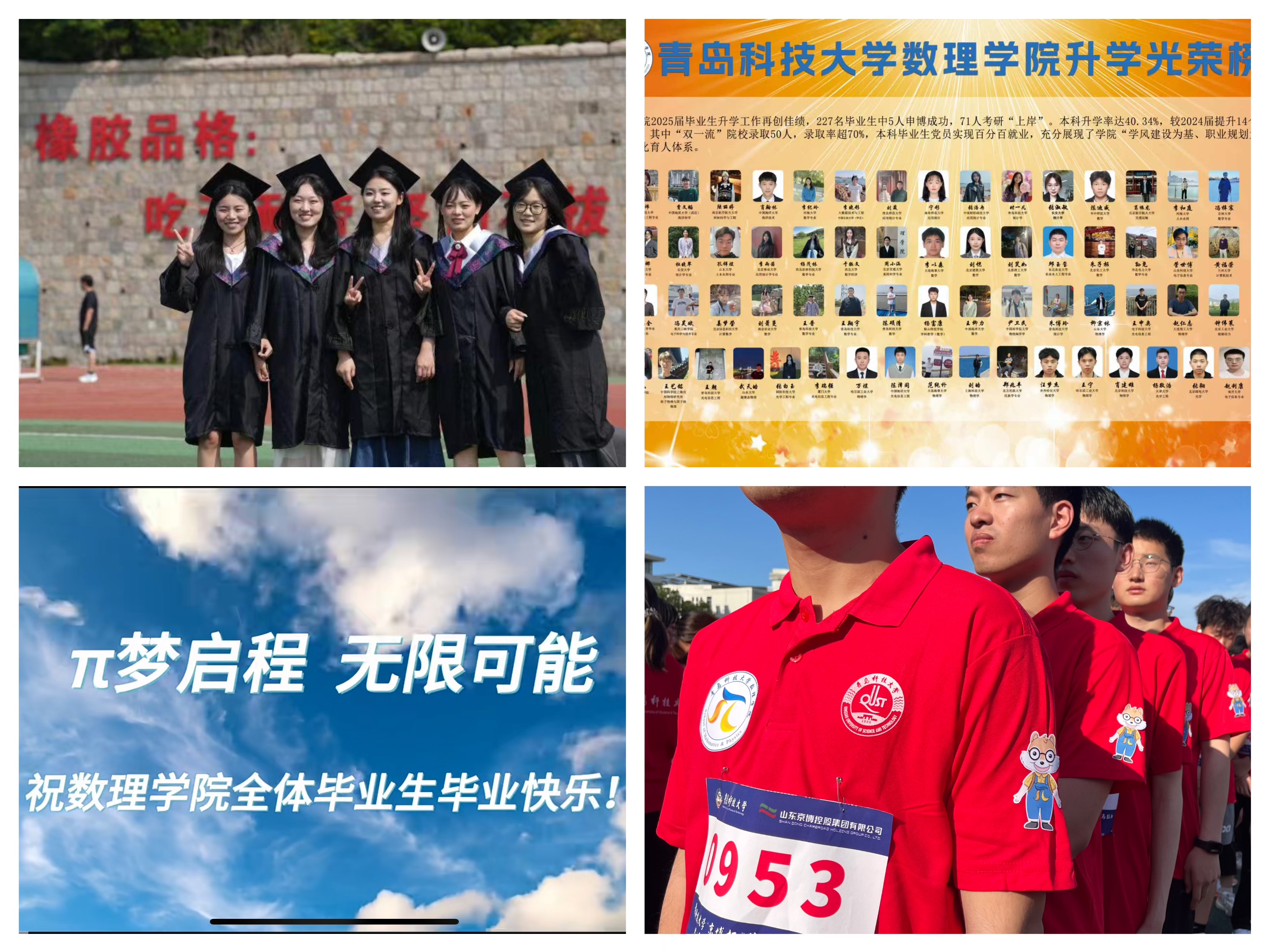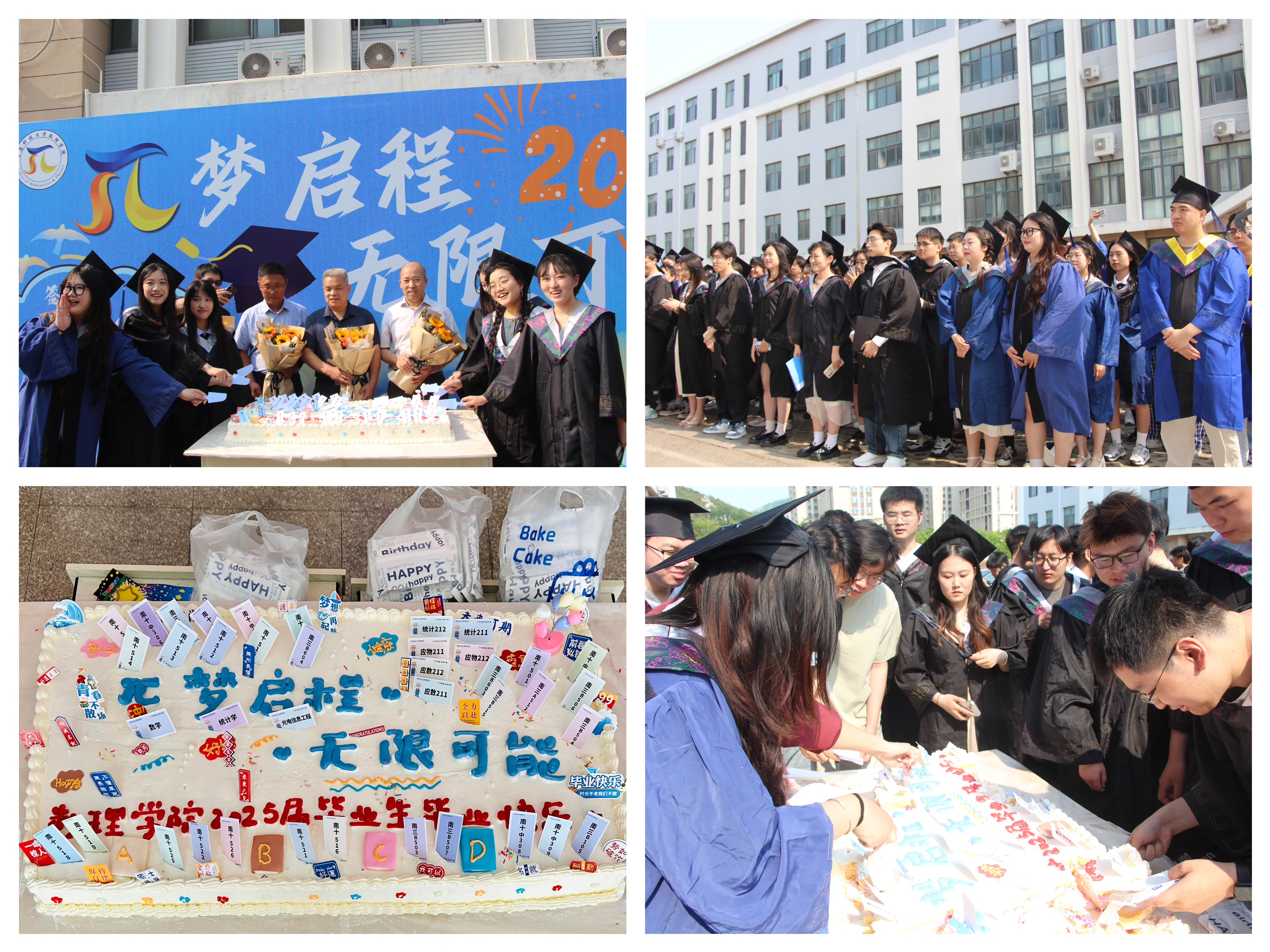 π梦启程:一场属于数理人的浪漫告别。学院在广场举行2025届毕业典礼,现场设置“π”系主题喷绘,以“黄金分割”为设计理念的背景板,将数学之美与育人理念完美融合。典礼上,院长杨树国致辞,勉励毕业生秉持数理人的严谨与创新精神,在人生新阶段勇攀高峰。随后,2025届毕业生“我最喜爱的老师”代表张瑞坤、高鹏发言,向即将踏上新征程的毕业生送上真挚的祝福。学生代表统计211班孟笑然在温暖的发言中表达了对母校的感恩和对未来的决心。毕业生向教师献花致谢,全体师生共同分享印有院徽和毕业生宿舍号码的纪念蛋糕,现场气氛温馨热烈。
