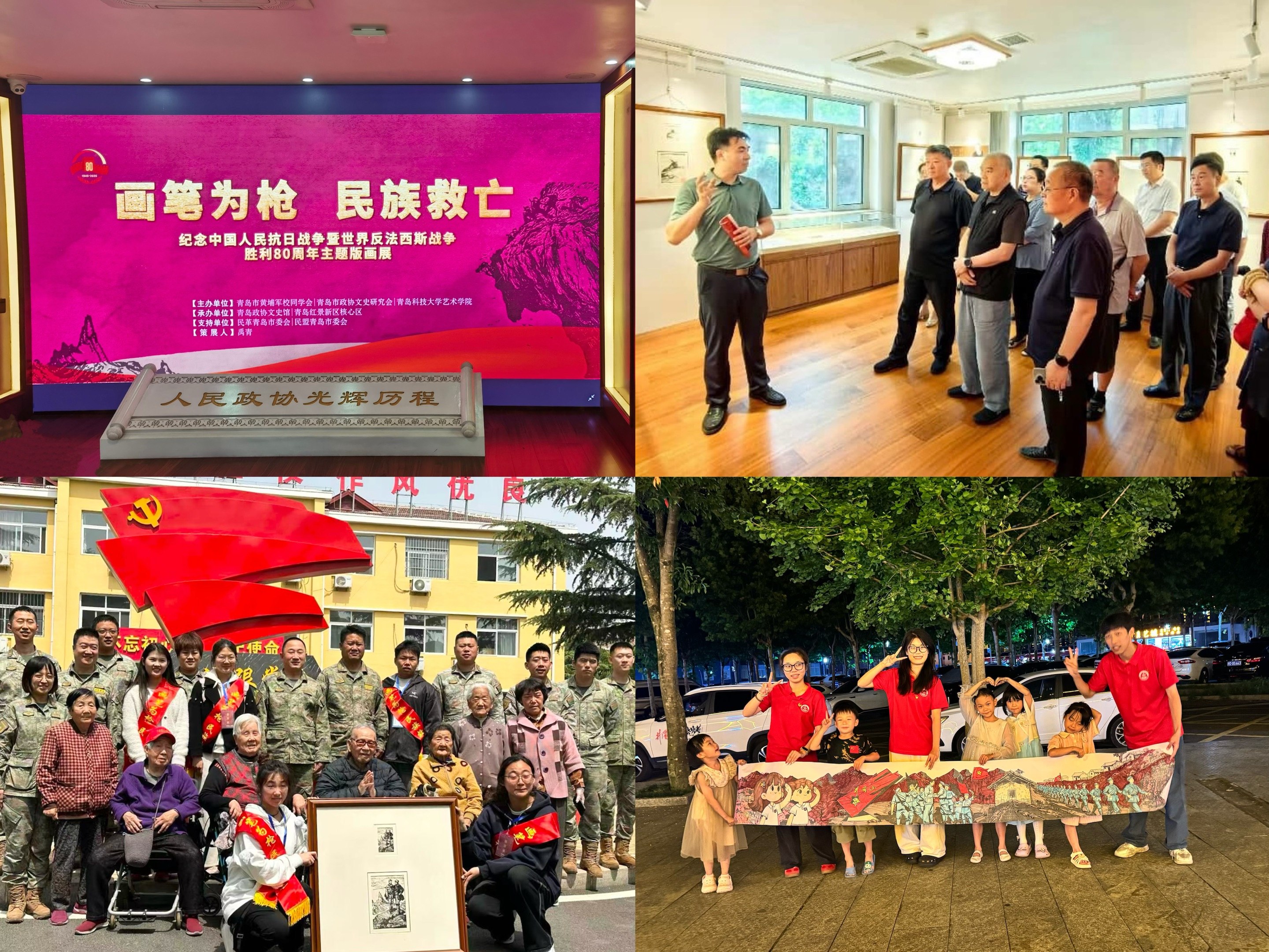 学院师生走进青岛市政协文史馆、走进干休所、走进中小学校,举办了“画笔为枪 民族救亡”——纪念中国人民抗日战争暨世界反法西斯战争胜利80周年主题画展,面向现役士兵、抗战老兵及家属开展宣讲,与少年儿童共绘十米红色长卷,旨在通过一堂生动的爱国主义教育实践课,引导大家在艺术鉴赏中重温历史、致敬英雄,厚植爱国情怀。