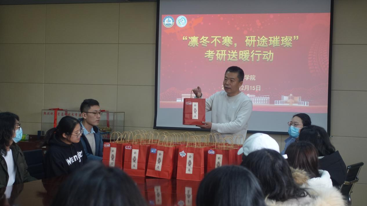 12月15日下午,为鼓舞我院毕业生学子士气,缓解备考压力,外国语学院党委副书记兼副院长刘尧老师和辅导员老师们在517室为考研学子送上冬日的温暖祝福和亲切关怀。