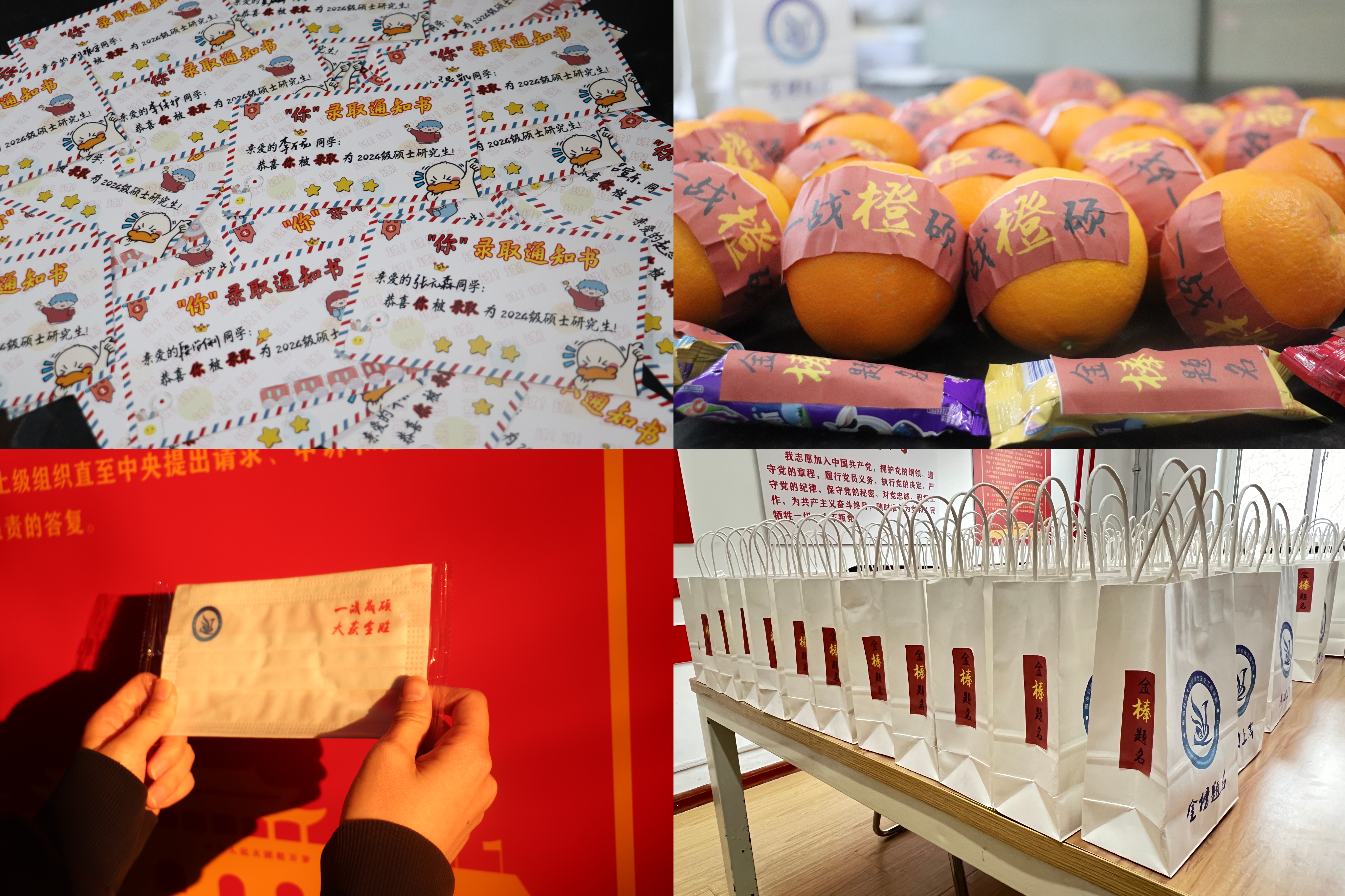 学院精心设计“爱心加油包”,以考研学子最期待的礼物“录取通知书”为出发点,用心设计“‘你’录取通知书”,‘你’谐音“拟”,讨好彩头,增添信心,并细心设计“男生版”“女生版”,毕业生辅导员为每一位考研学子手写“录取”姓名,博得考研学生暖心欢喜。在每一颗橙子上,粘贴“一战‘橙’硕”红色纸贴,棒棒糖上也贴有“金‘棒’题名”字样。此外,学院也为考研学生定制了“大获全胜”防护口罩,调整考研学子紧张心态,祝福大家成功上岸!
