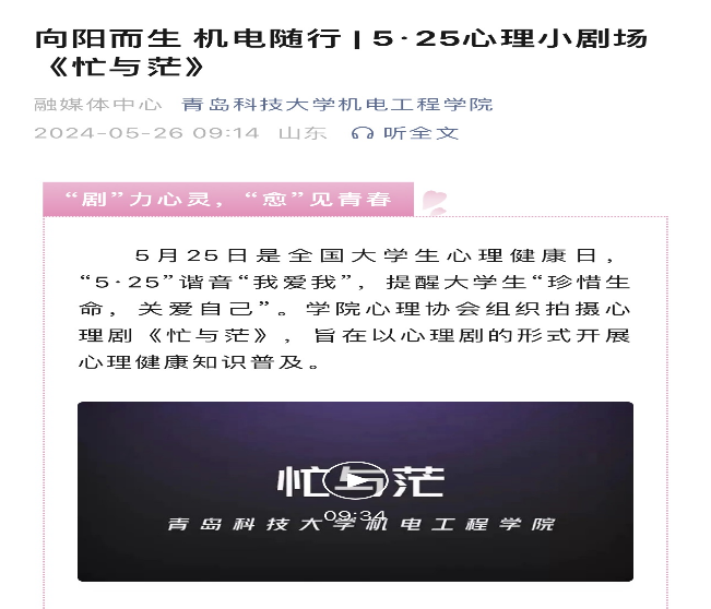 为缓解大学生紧张、焦虑、自卑等消极情绪,帮助学生突破精神内耗的自我成长与心灵的蜕变,机电工程学院心理协会拍摄、制作心理剧,采用心理剧展演这一富有趣味性和代入感的形式,普及心理健康教育知识。