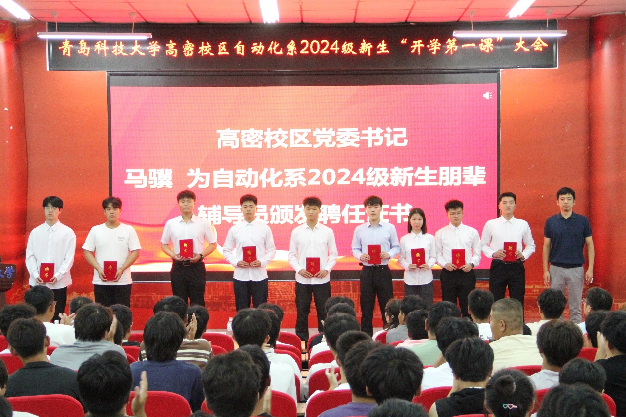会上,王作辉宣读《关于聘任天游ty8检测中心高密校区自动化系2024级新生朋辈辅导员的决定》,曹新明宣读《关于聘请天游ty8检测中心高密校区自动化系2024级新生班主任的决定》。马骥、曹新明为新生朋辈辅导员、新生班主任颁发聘书。教师代表李丽、在校生代表自化2172班薛志辉、新生代表电气2473班赵栩浩分别作交流发言。