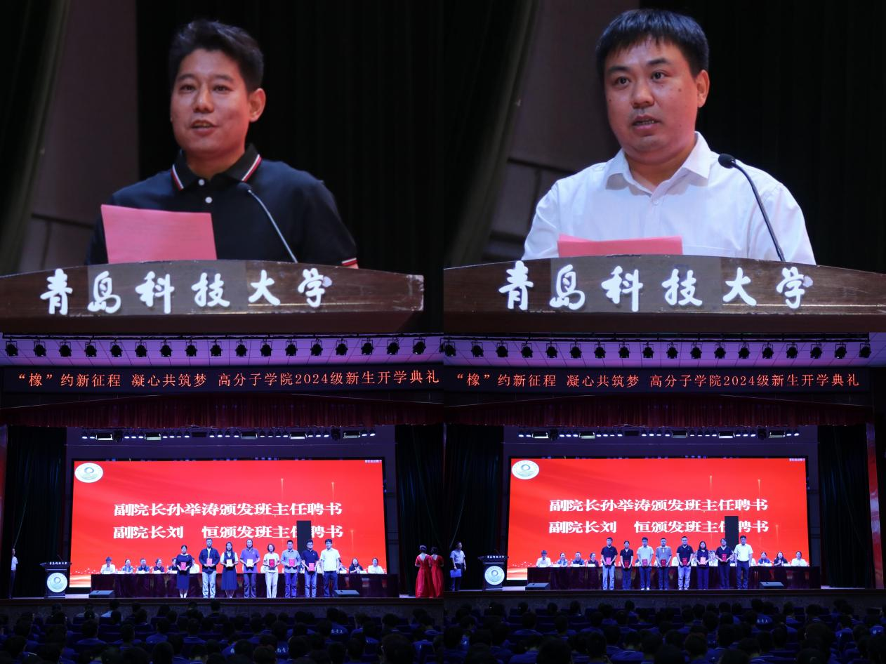 王庆富宣读《关于高分子学院2024级班主任聘任的决定》;孙举涛、刘恒为班主任老师颁发聘书。