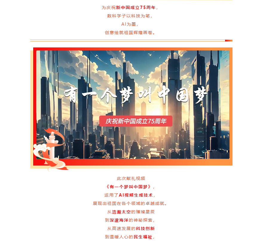 数据科学学院创新爱国主义教育的方式方法,将其融入学生专业知识的学习实践中,开展了“代码传情:三行代码颂祖国”活动,学生运用所学的编程知识,用三行代码表达对祖国的热爱和祝福;开展“时光焕彩:AI唤醒老照片的祖国记忆”活动,同学们收集具有历史意义的与祖国发展相关的照片,运用人工智能技术,如图像修复、上色、动态化等手段,让老照片焕发生机;院学生会运用AI视频生成技术,创新出品AI献礼视频《有一个梦叫中国梦》,让同学们在提升专业本领的同时,以拳拳之心告白祖国。