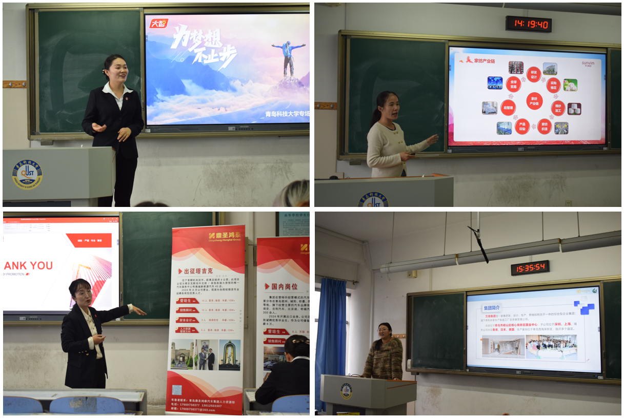 主题班会结束后,孚日集团股份有限公司等6家受邀企业依次开展招聘宣讲。宣讲会现场气氛热烈,学生们求职态度积极,企业代表介绍了公司概况、企业文化和职业前景,并对学生们的表现给予了高度评价,表达了对优秀人才的期待。