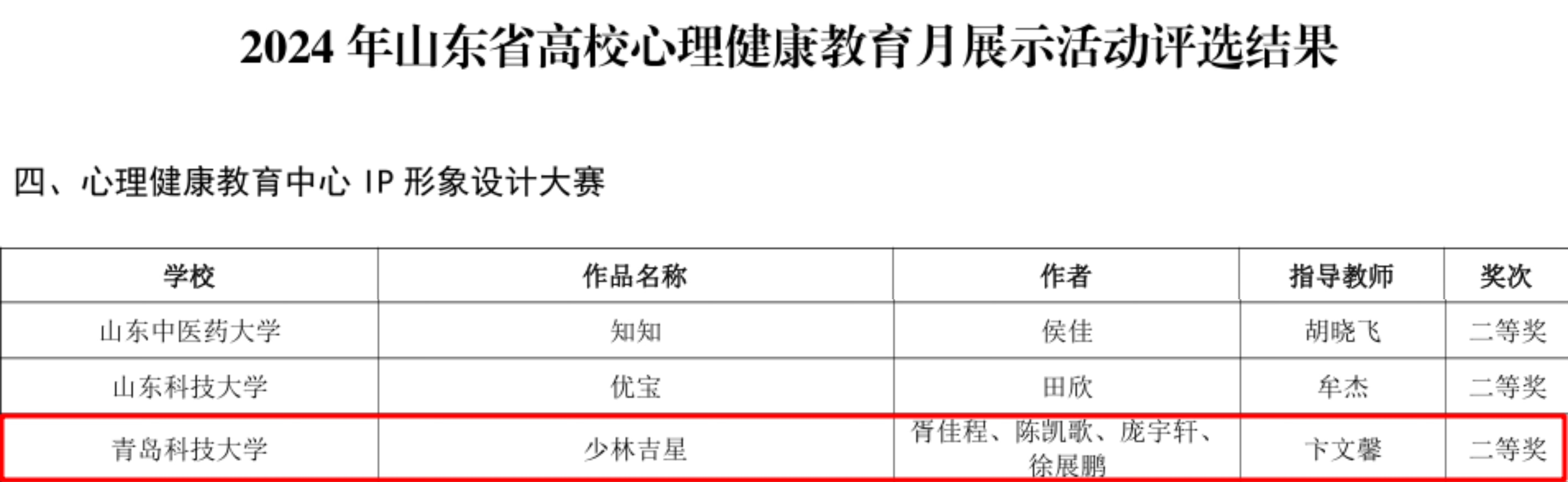 近日,山东省高等学校思想政治教育研究会、大学生心理健康教育专业委员会公布了2024年山东省高校心理健康教育月展示活动评选结果,数据科学学院《少林吉星》获得心理健康教育中心IP形象设计大赛二等奖。