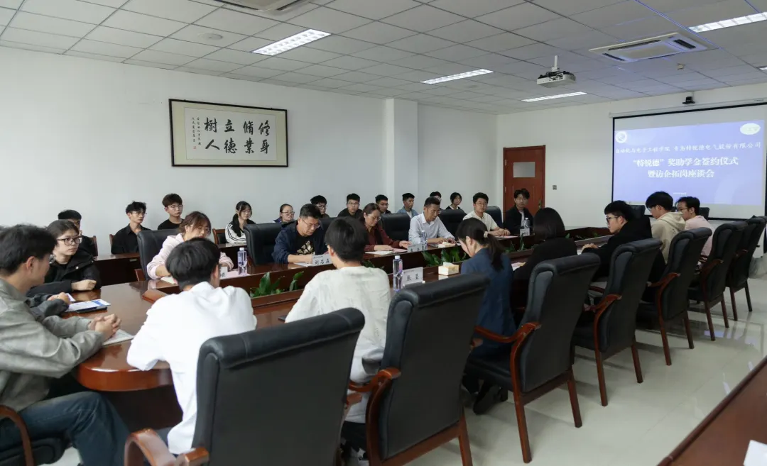 为进一步深化校企合作,助力高层次人才培养,10月15日下午,自动化与电子工程学院与青岛特锐德电气股份有限公司于学院楼408会议室联合举办了“特锐德”奖助学金签约仪式暨访企拓岗座谈会。青岛特锐德电气股份有限公司人力资源中心总经理韩增雪、人力资源中心人力总经理助理张莹、学院党委书记李卉、学院常务副院长兼机器人学院常务副院长巩敦卫、学院党委副书记兼副院长刘名森出席会议,2025届毕业生辅导员老师张郁浩、赵赪赪,以及首届“特锐德”助学金获奖学生与2025届毕业生代表参加会议。会议由学院党委副书记兼副院长刘名森主持。