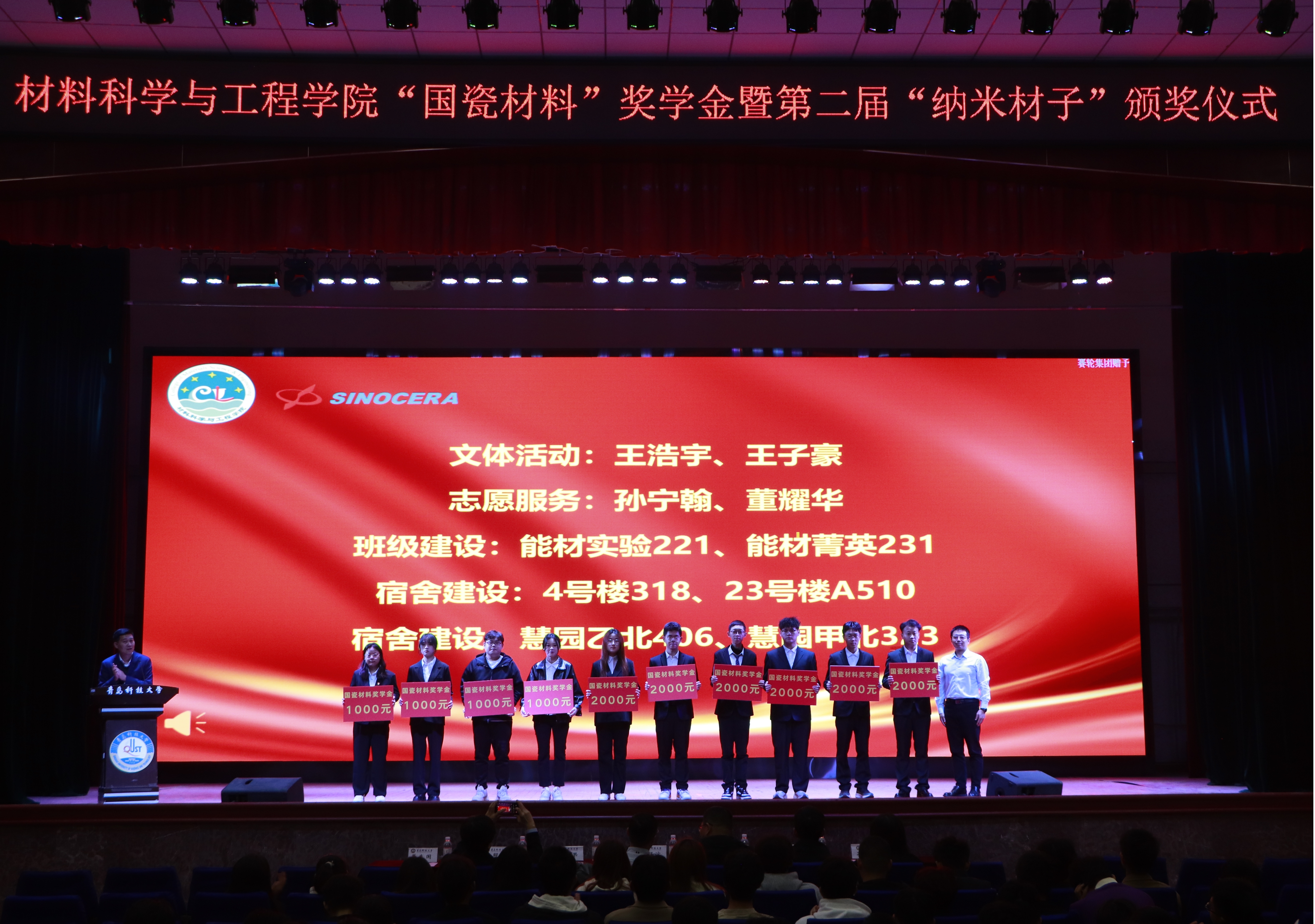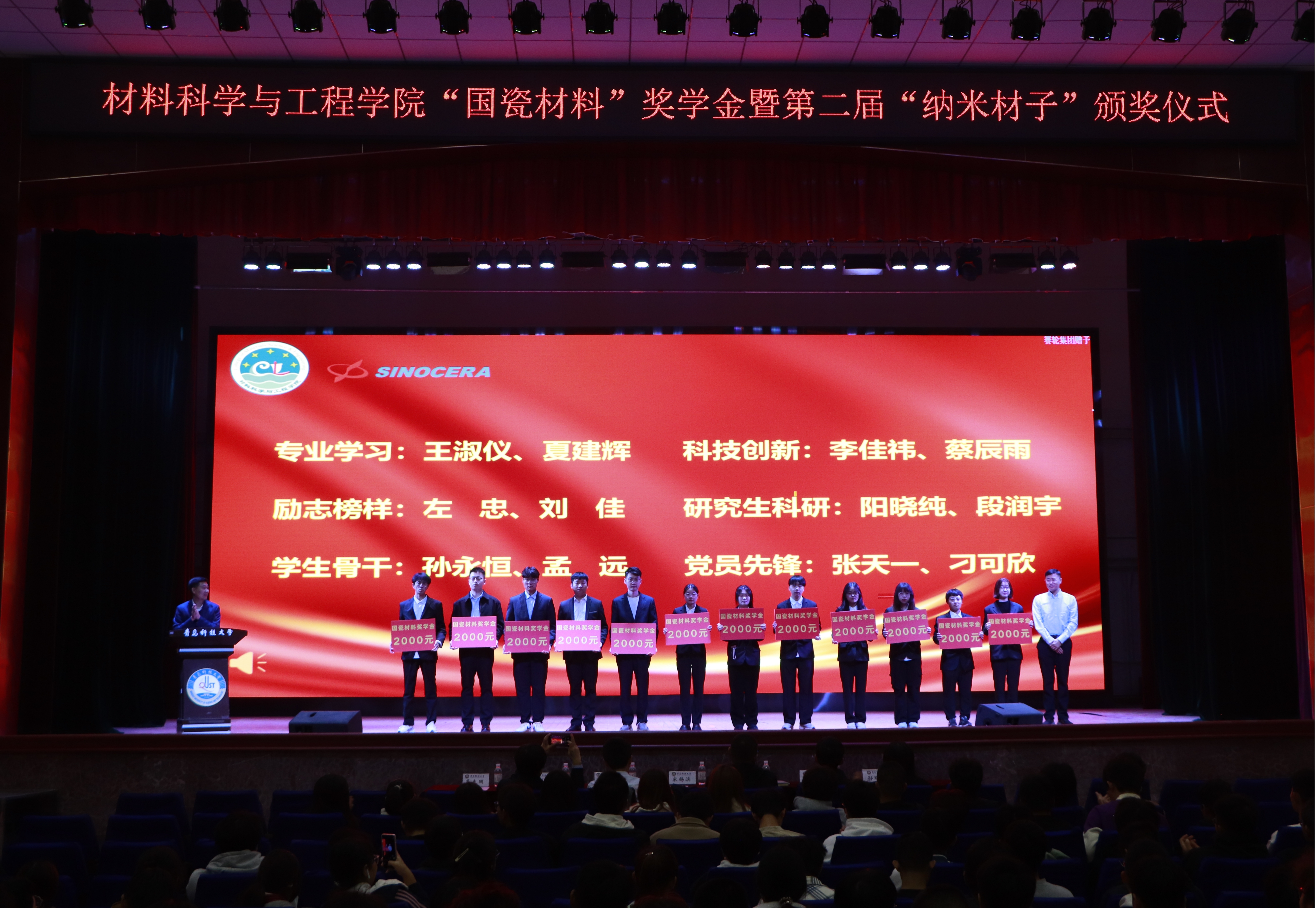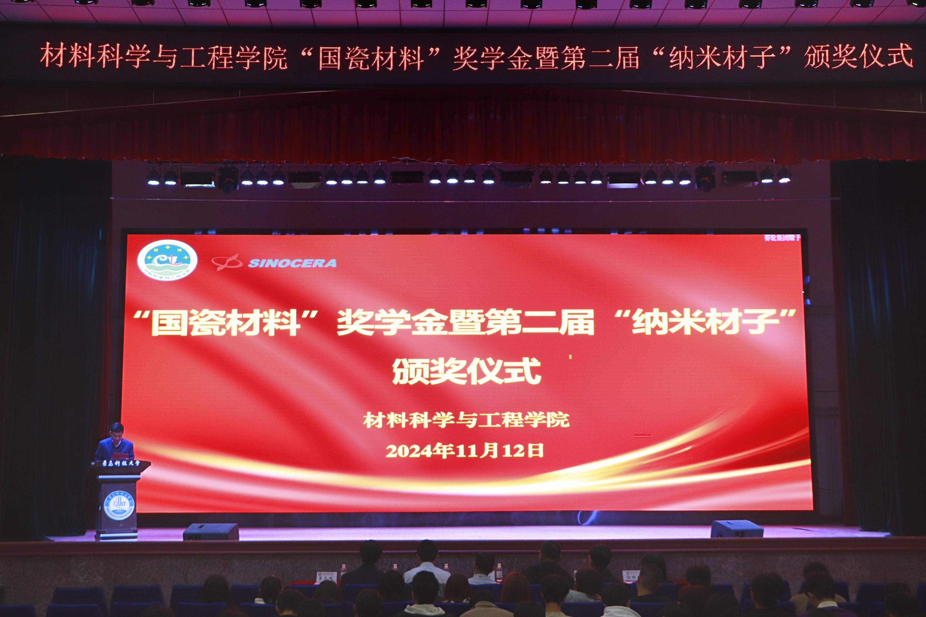 为顺应科技强国、人才强国发展战略,提高材料学子综合素养水平,营造良好的学院文化氛围,传承“纳米精神”,切实发挥先进典型示范作用,材料学院于11月12日下午在西礼堂举行材料学院“国瓷材料”奖学金暨第二届“纳米材子”颁奖仪式。山东国瓷功能材料股份有限公司创始人之一、董事、党委书记宋锡滨、人力资源总监李银果、材料学院党委书记孟照国、院长李桂村、材料学院党委副书记兼副院长葛夫国、副院长隋凝、孙瑞雪、各年级辅导员、获奖学生与各年级学生代表参与活动。