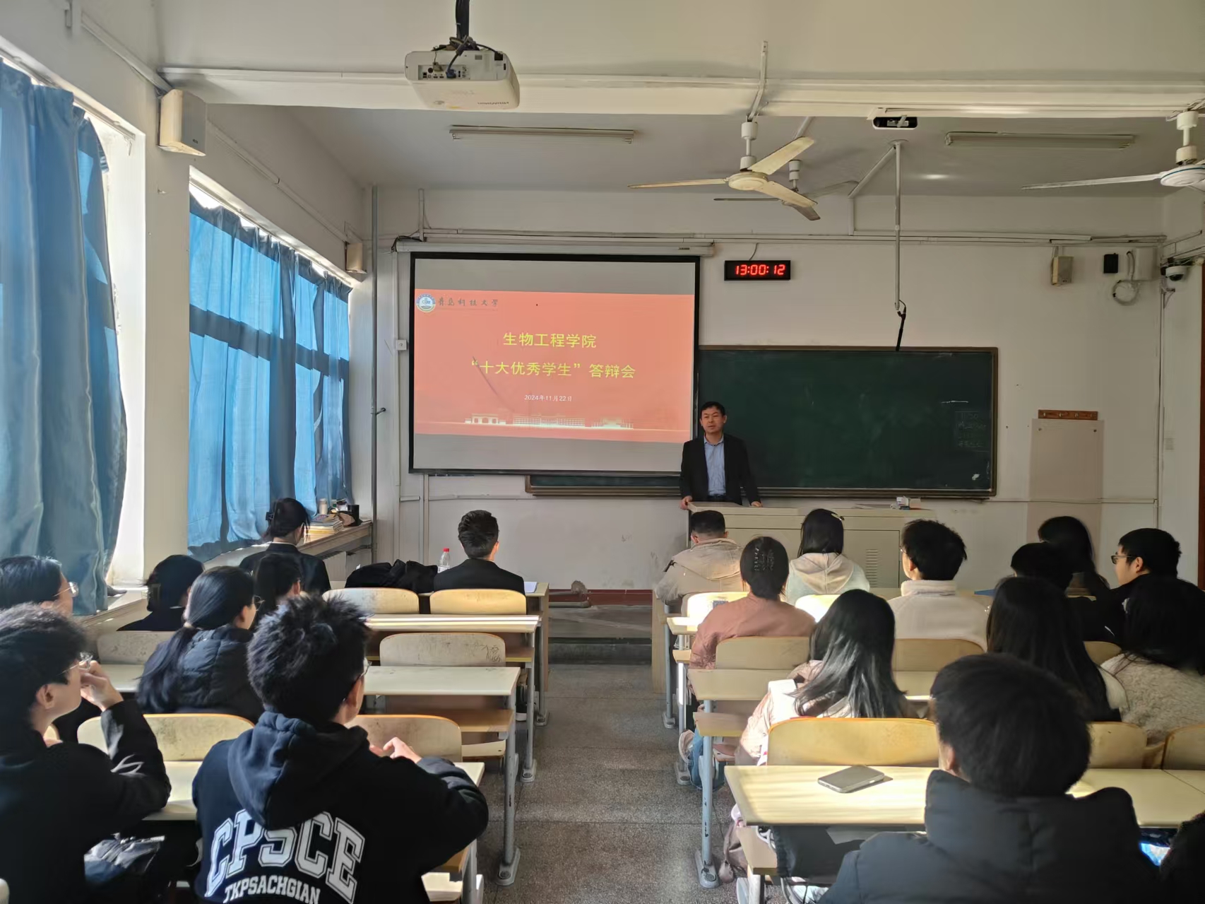 为充分发挥优秀学生的带头模范作用,激励学院学子奋发作为,11月22日上午,生物工程学院在二教201举办“十大优秀学生”答辩会。生物工程学院学工办主任秦洪庆、辅导员代表及学生代表参与。