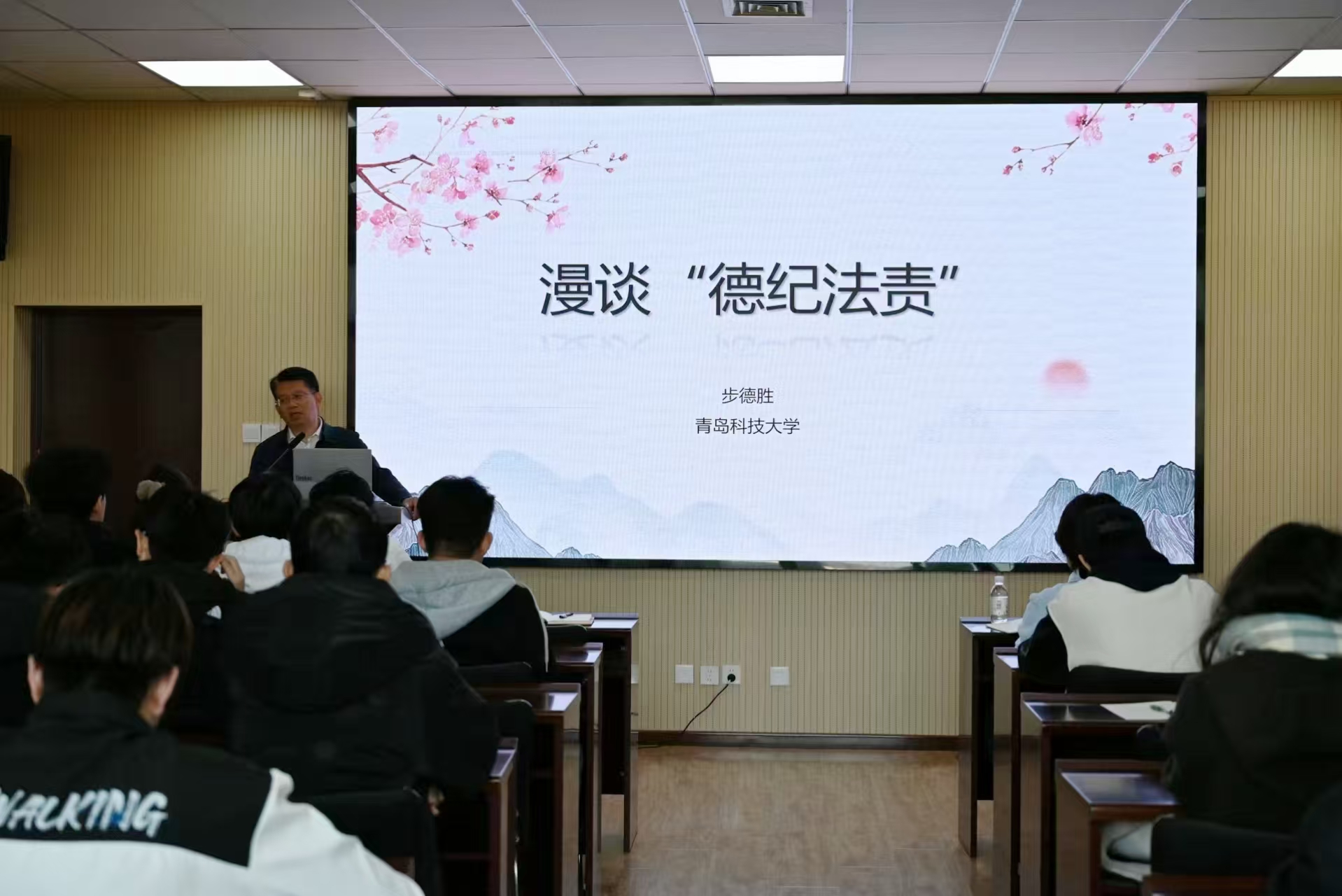 步德胜以《漫谈“德纪法责”》为主题,为同学们进行了一场深入浅出的讲座。他详细阐述了“德纪法责”四个字的历史起源、现实内涵,同时结合具体事例,从“道德”“纪律”“法治”“责任”四个方面,阐述了其对于培育社会主义核心价值观的重要重要性,鼓励同学们要树立正确的道德观念,自觉践行社会主义核心价值观,为构建和谐社会贡献力量。