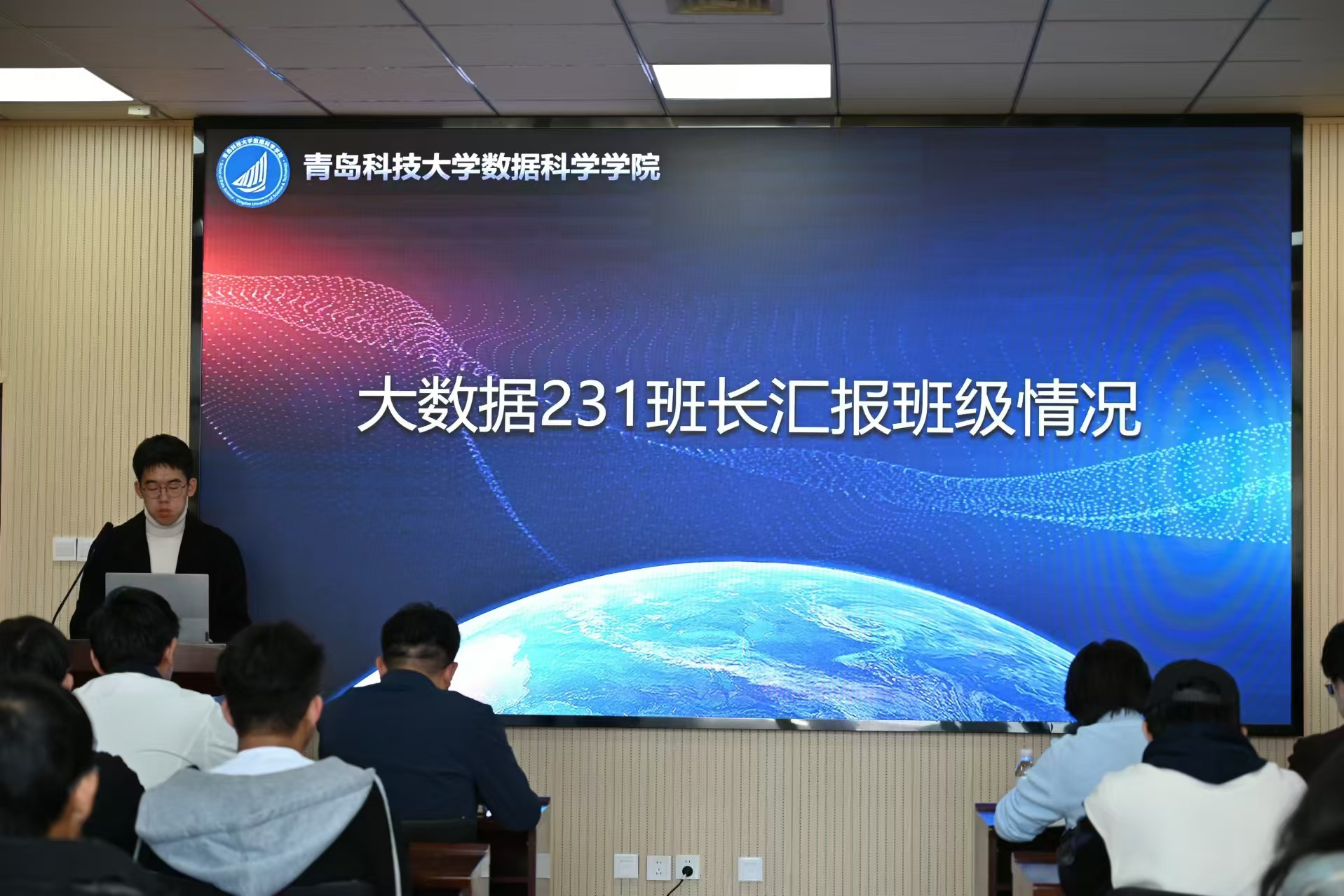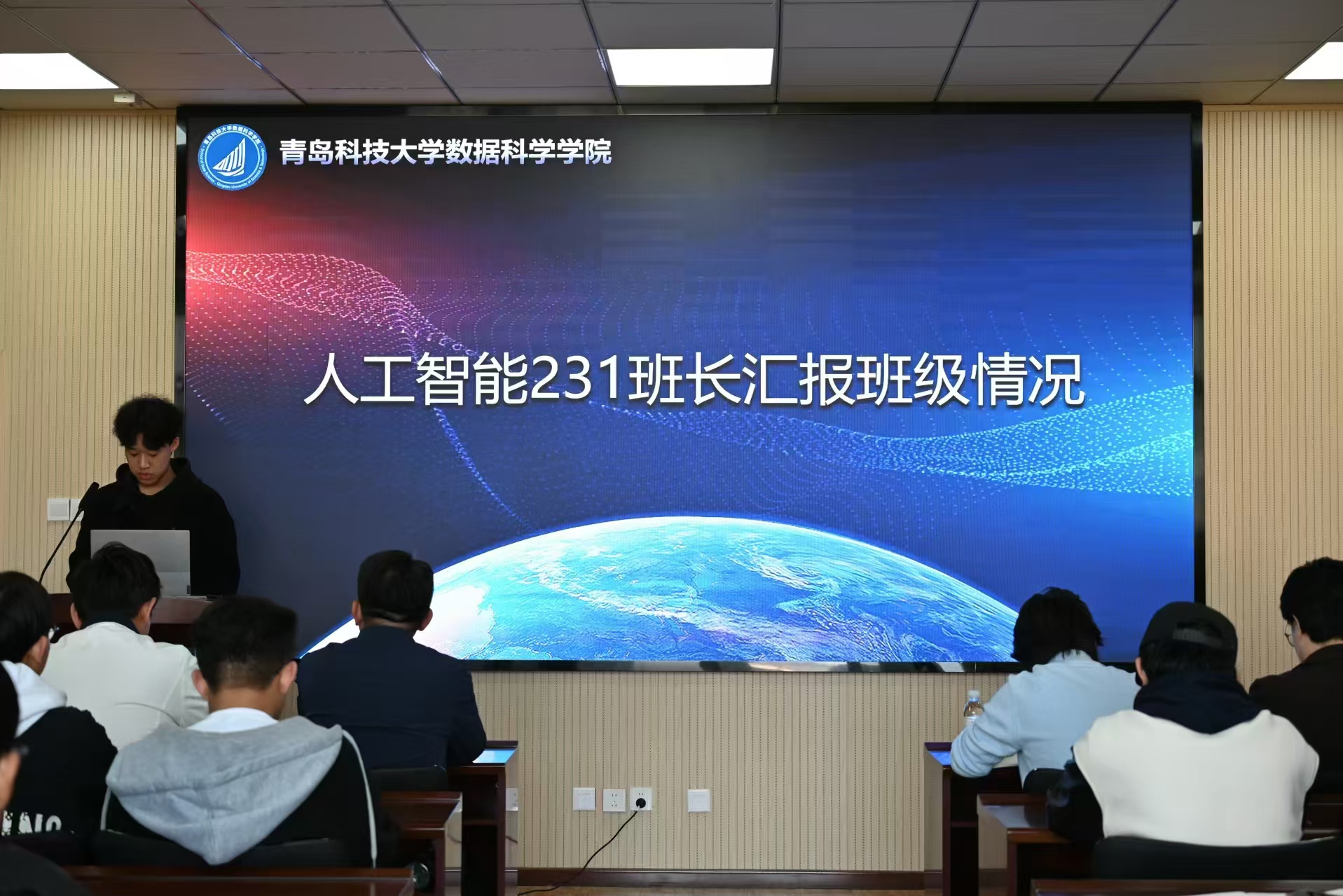 大数据231班班长魏建基和人工智能231班班长李冠霖分别围绕组织建设、班风建设、学风建设、科创竞赛、社会实践、文化建设等方面汇报了班级情况。