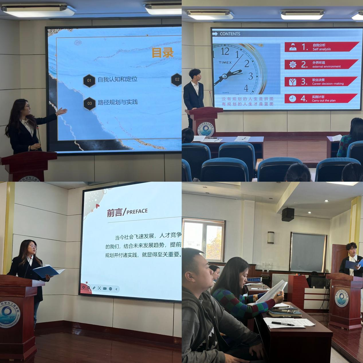 本次大赛分为成长赛道和就业赛道两大板块。经过自主报名、年级选拔、材料初审等环节,共有18位同学进入决赛。在决赛展示中,选手们以饱满的热情和坚定的信念,围绕“‘橡’导青春志,‘工’绘未来图”、“高分子匠心筑梦,职业路砥砺前行”等主题充分展示了在生涯规划方面的独特见解和勇于追梦的风采。经过紧张而激烈的角逐,评委们根据选手们的表现及规划方案的可行性、创新性等因素进行综合评定,最终评选出了各个赛道一等奖2人、二等奖3人、三等奖4人。