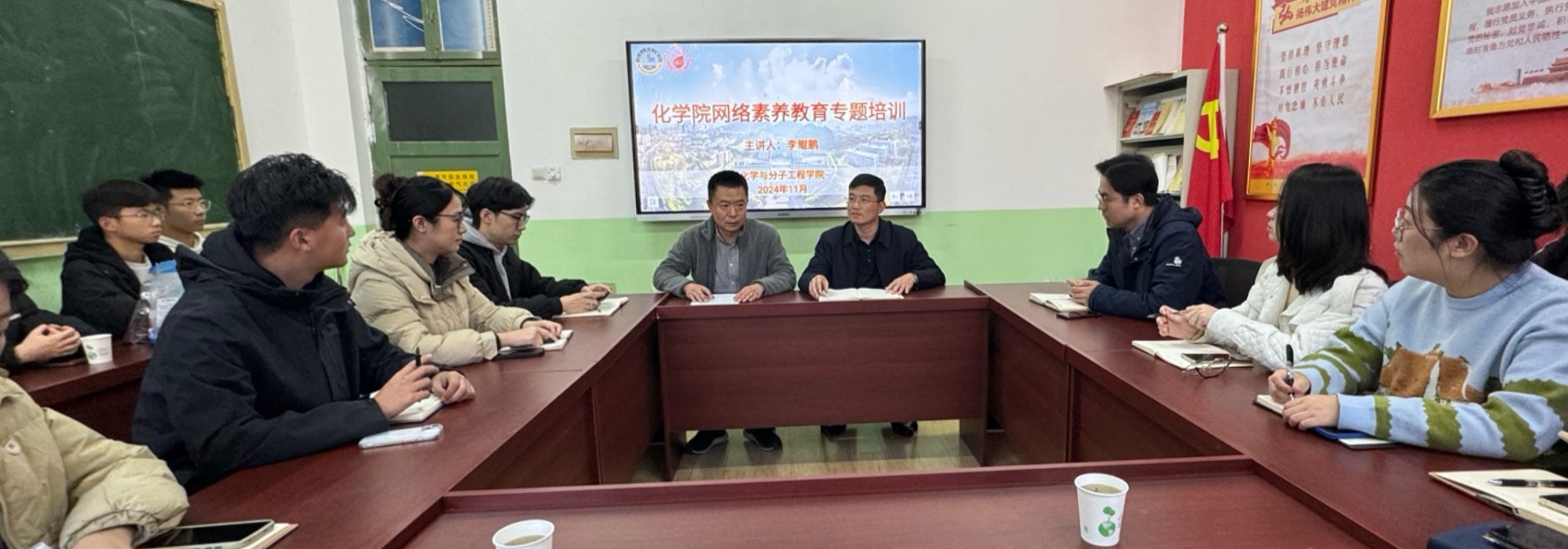 11月29日,化学院在一政党建活动室举行网络素养教育专题培训。此次培训旨在提升全体专兼职辅导员和学生骨干的网络素养,加强网络宣传与舆情管理的能力。培训由党委宣传部副部长兼新闻中心主任、报社社长李鲲鹏主讲,化学院党委副书记刘尧主持会议。