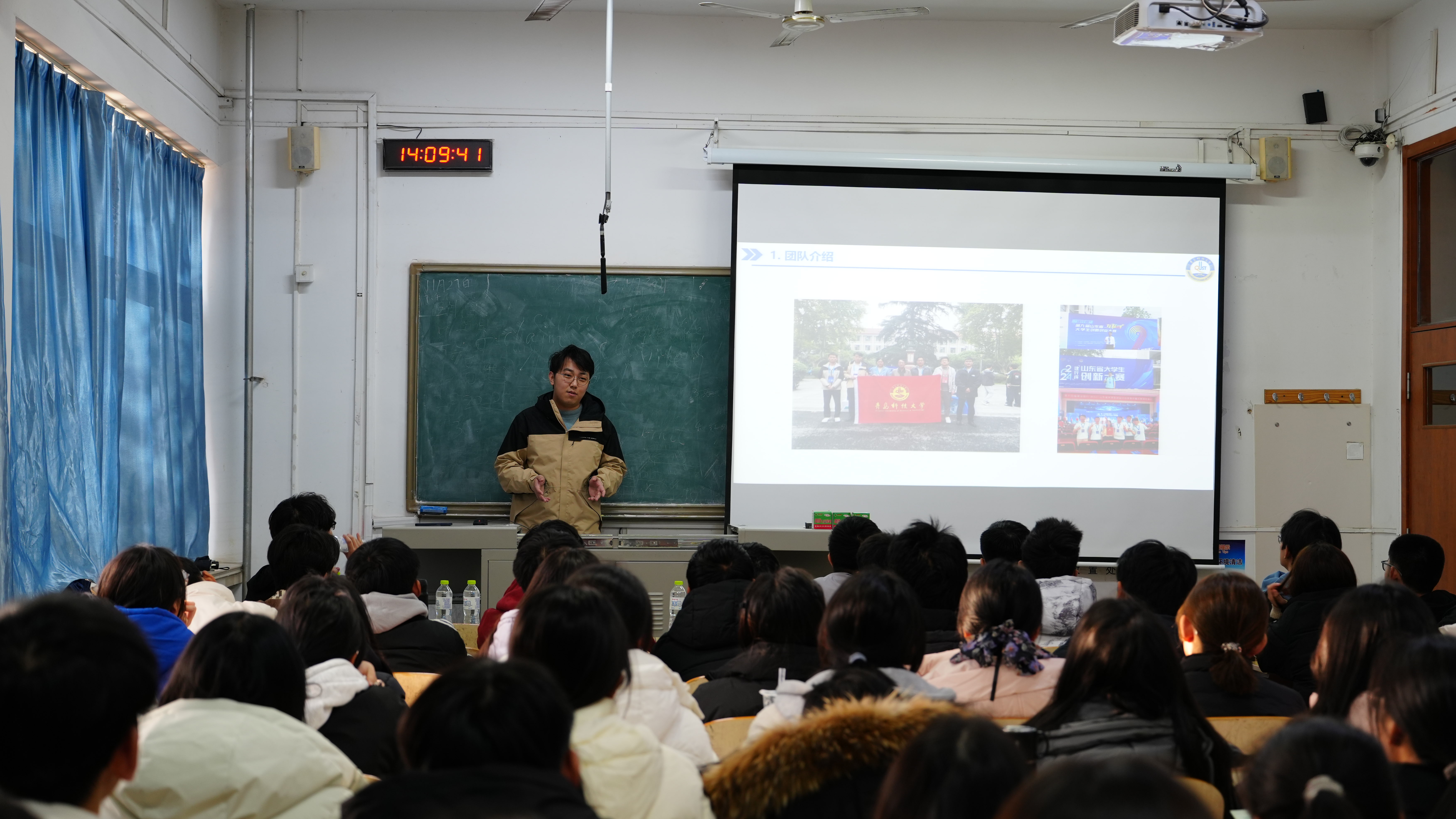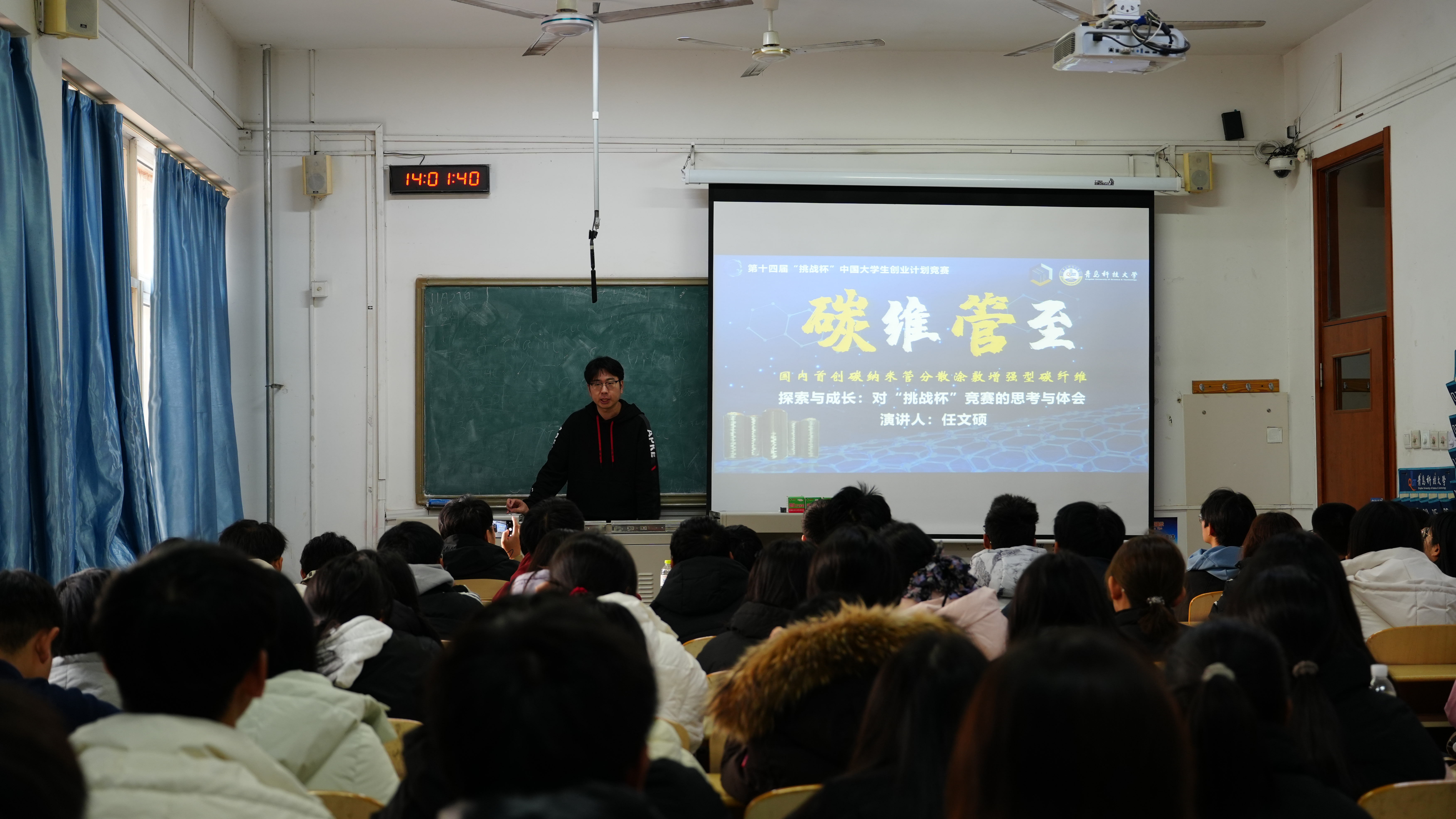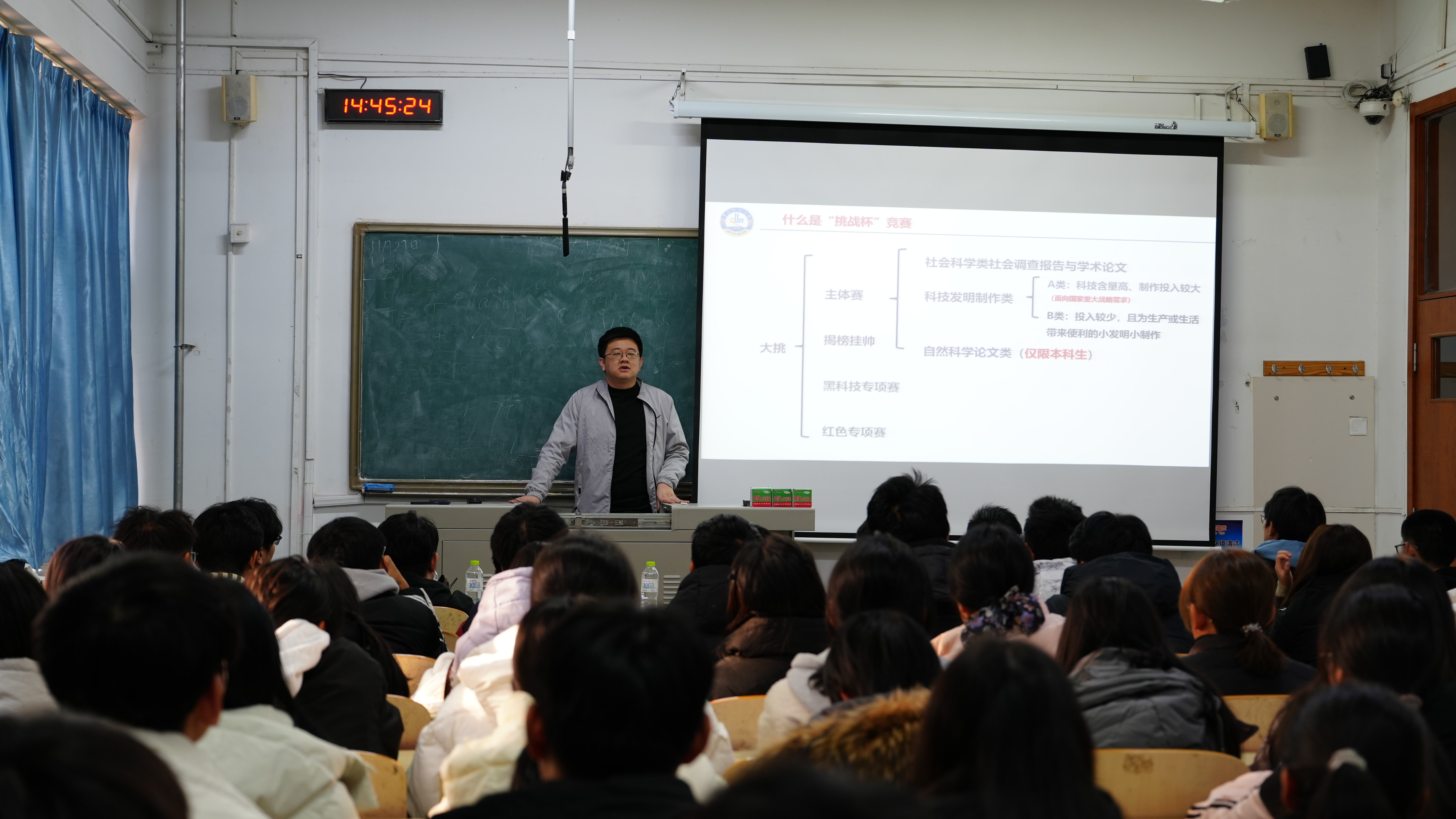 随后,杨奉儒为同学们详细讲解了挑战杯赛事的具体内容和参赛要点,他结合自己指导挑战杯项目的经验,详细阐述了项目选题、方案设计、实验验证和答辩准备等各个环节的注意事项和技巧。同时,他还通过生动的案例和具体的数据,让同学们更加直观地了解了挑战杯赛事的参赛流程和评分标准,激发了同学们对参与科研创新的信心与动力。