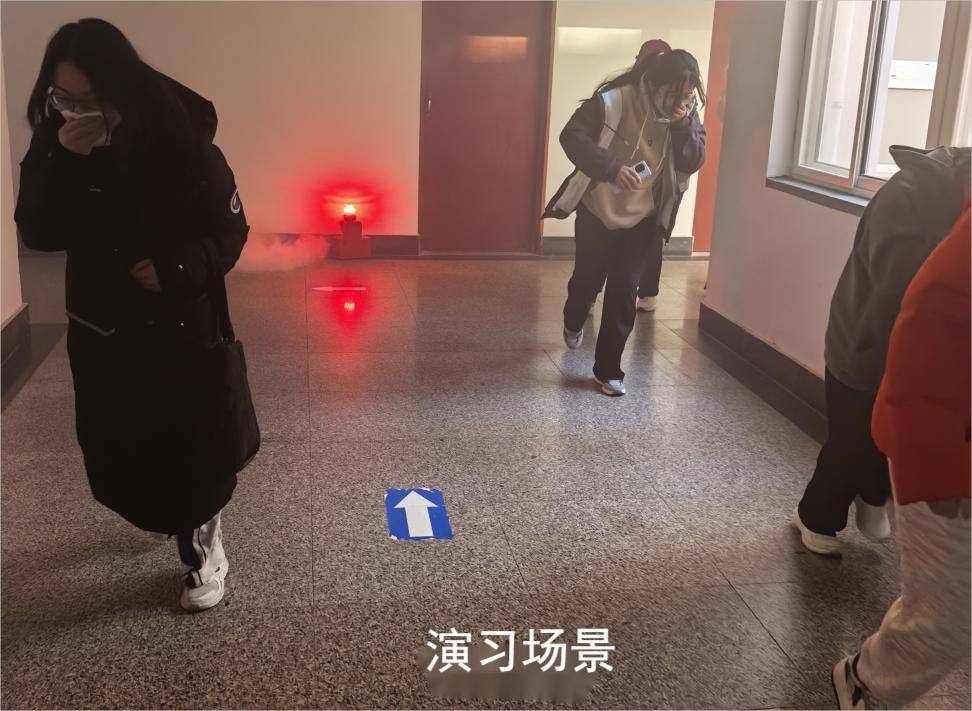 随着警报声响起,同学们用湿毛巾捂住口鼻、弯腰前行,按照预定的疏散路线迅速而有序地撤离到安全区域。整个疏散过程紧张有序,同学们到达指定集合点后,各宿舍进行点名确认,确保无人遗漏。