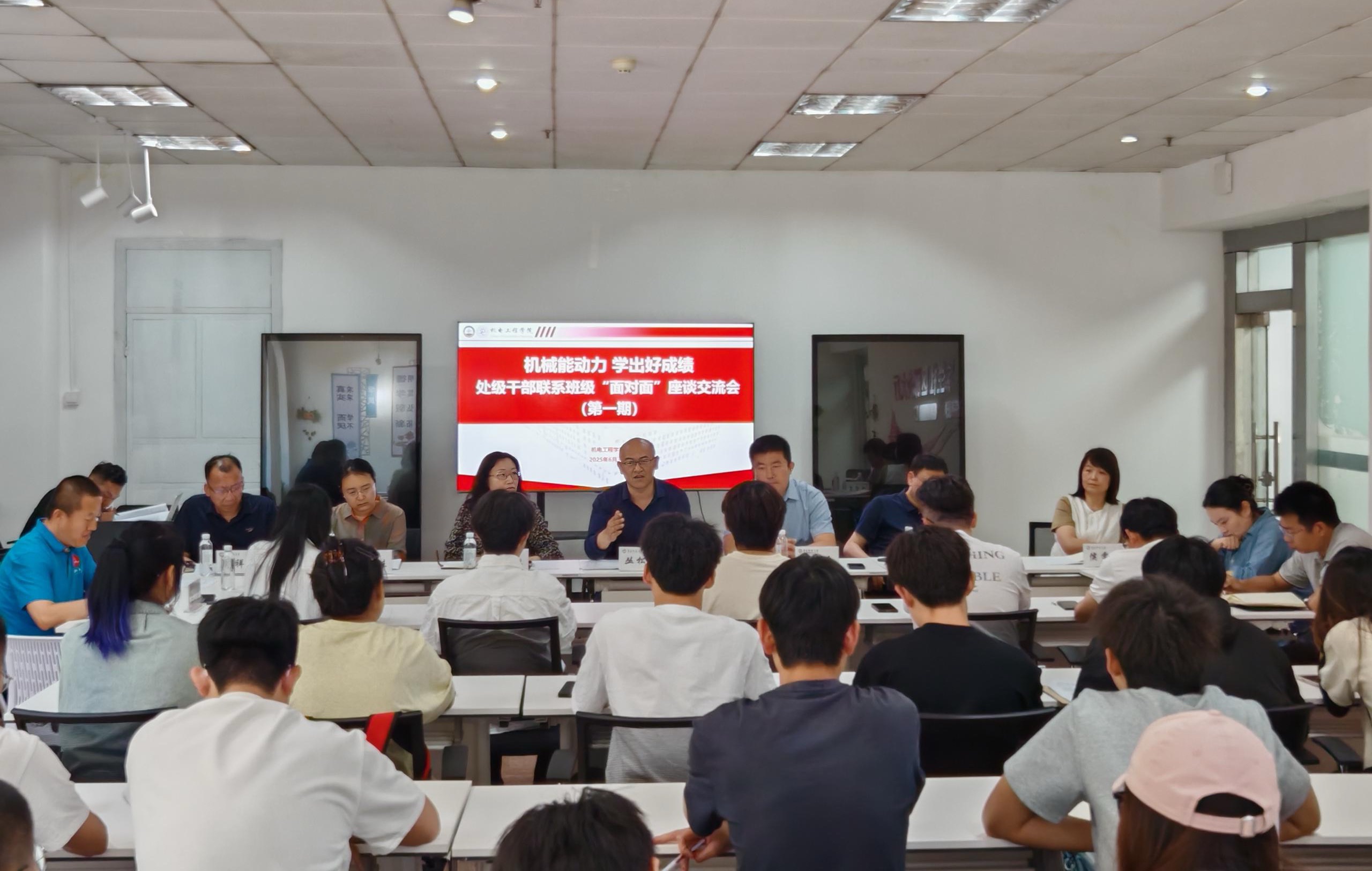 6月3日,机电工程学院在“一站式”学生社区组织“机械能动力、学出好成绩”处级干部联系班级“面对面”座谈交流会(第一期)。校离退休工作处处长丛松涛、国际交流与合作处处长陈兵、党委统战部副部长魏琳、纪委监察专员办公室王豫凌、侯雯雯、孟祥军、李佳,学院2023级辅导员杜康、崔瑛,班主任代表潘弋人,2023级班长、团支书参加会议,会议由学院党委副书记兼副院长杨小明主持。