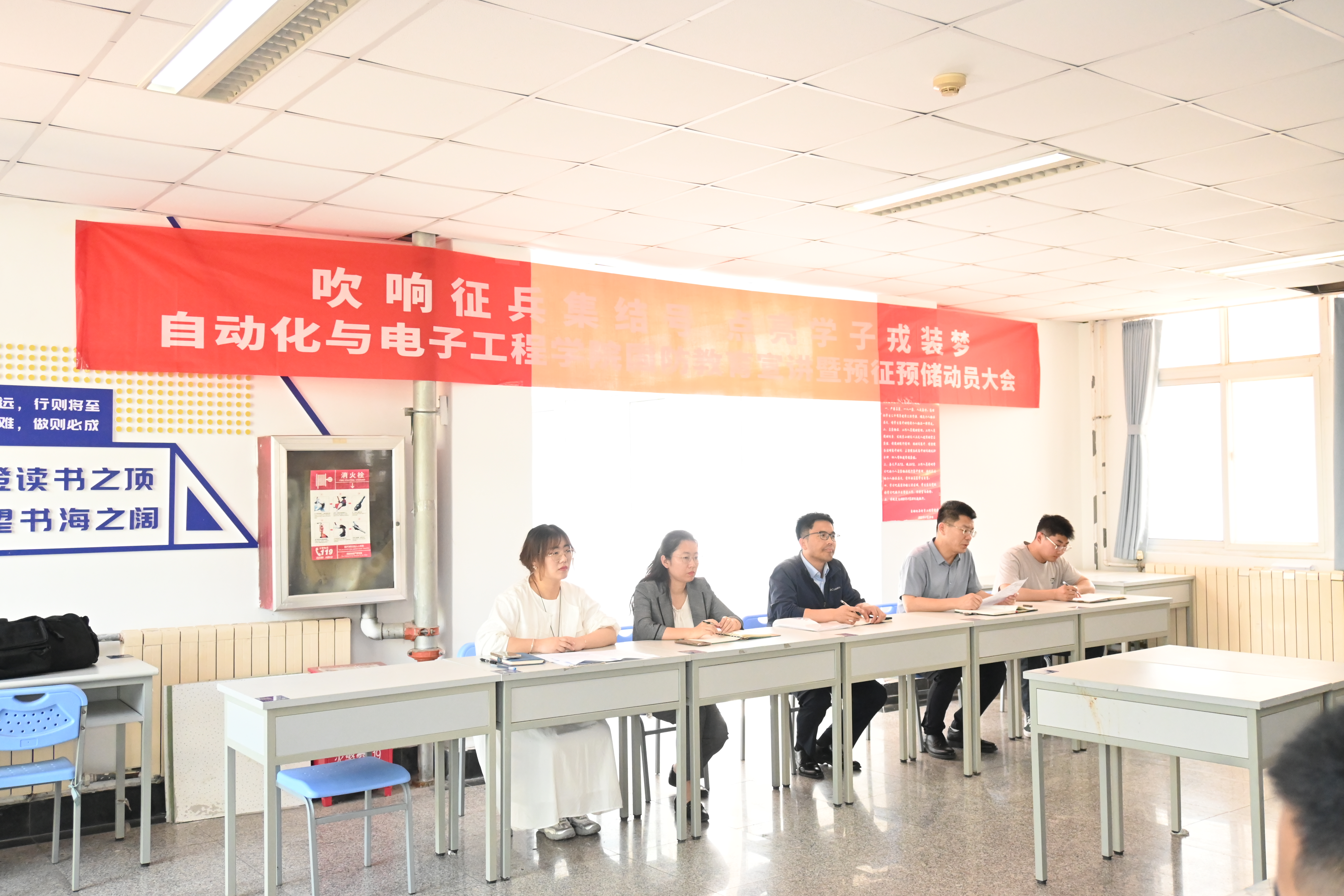 为深入学习贯彻习近平强军思想,落实全民国防教育使命任务,厚植广大学生的爱国情怀,进一步引导全体师生关心国防、建设国防、投身国防,5月27日,自动化与电子工程学院于北苑学生公寓七号楼一站式学生社区举办“吹响征兵集结号 点亮学子戎装梦”国防教育宣讲暨预征预储动员大会。校党委学生工作部副部长、武装部副部长李春家、学院党委副书记兼副院长刘名森、学院辅导员代表、退役大学生士兵、各年级意向参军入伍学生等60余人参加。