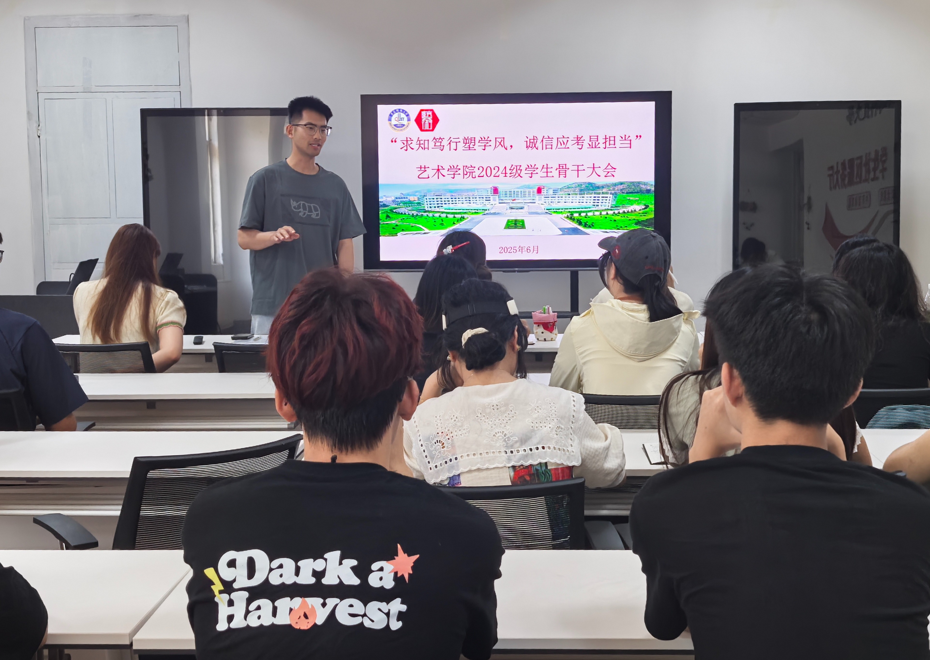 为加强学风建设,培育学生诚信应考意识,6月24日下午,艺术学院于“一站式”学生社区举办“求知笃行塑学风,诚信应考显担当”主题动员会议。会议由辅导员杨橙主持,2024级全体学生干部参加。